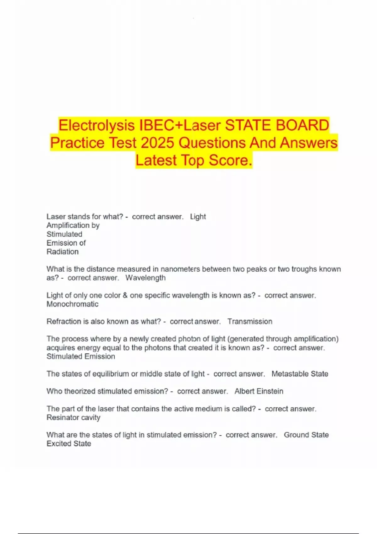 Electrolysis IBEC+Laser STATE BOARD Practice Test 2025 Questions And Answers Latest Top Score.