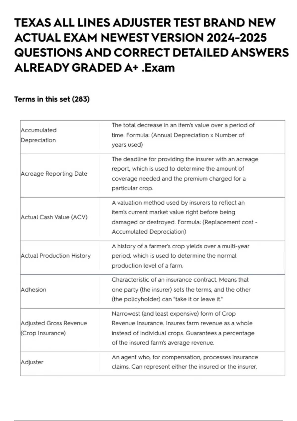 TEXAS ALL LINES ADJUSTER TEST BRAND NEW ACTUAL EXAM NEWEST VERSION QUESTIONS AND CORRECT DETAILED ANSWERS ALREADY GRADED A+ .Exam