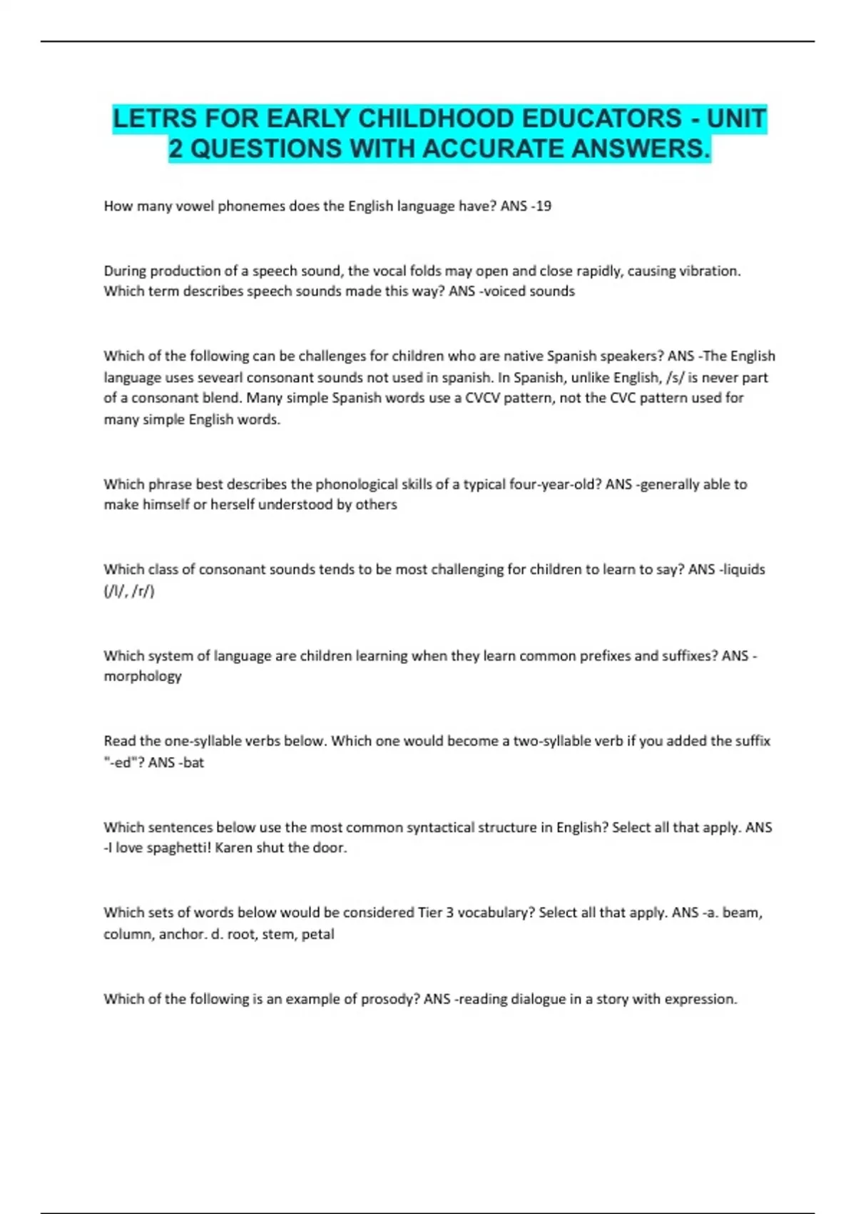 LETRS FOR EARLY CHILDHOOD EDUCATORS - UNIT 2 QUESTIONS WITH ACCURATE ANSWERS.
