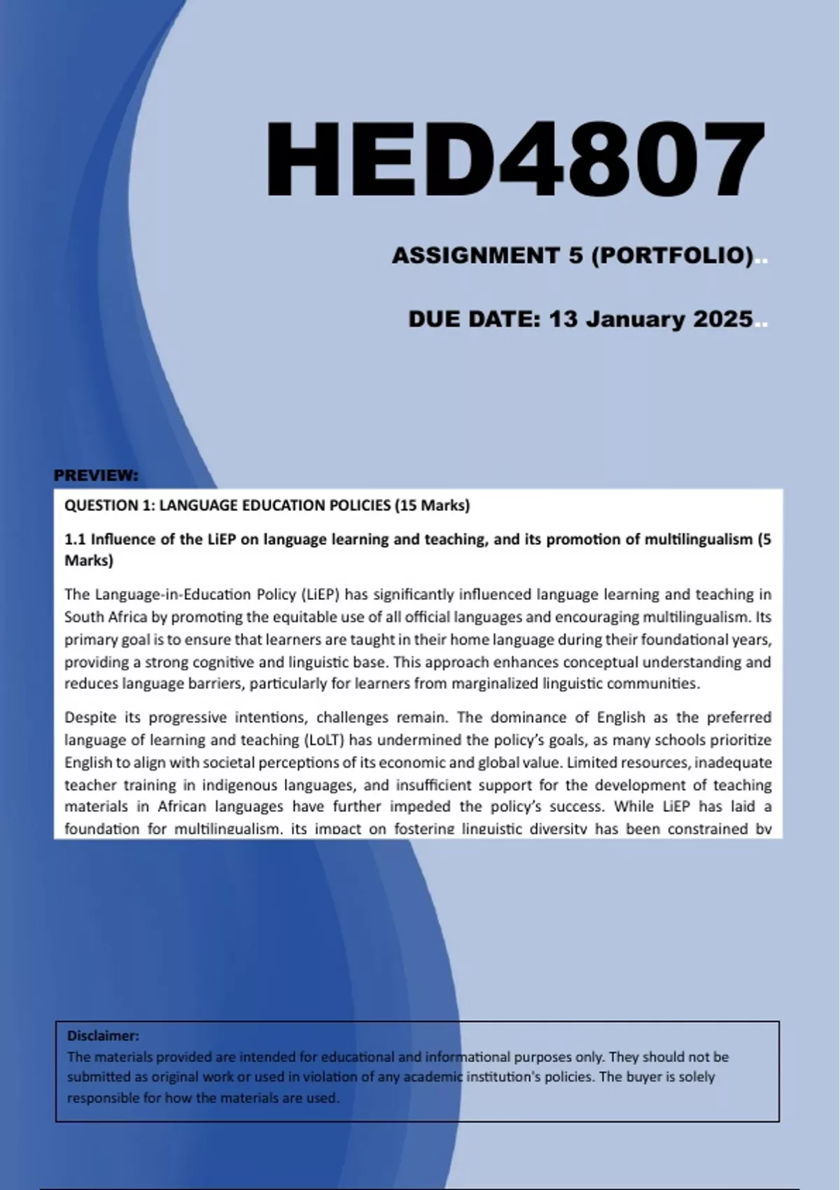 HED4807 Assignment 5 PORTFOLIO (COMPLETE ANSWERS) 2024 - DUE 13 January 2025