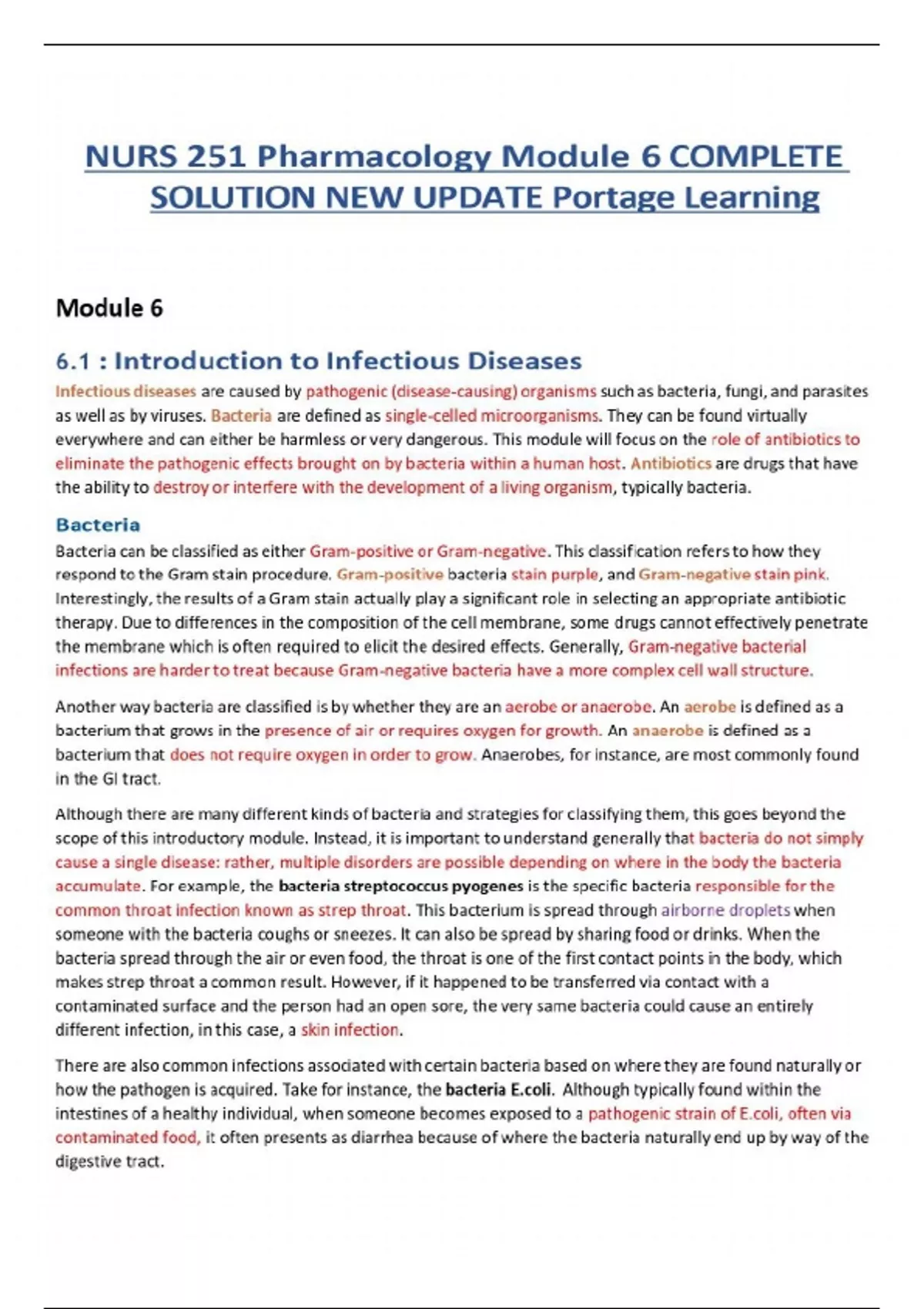 NURS 251 Pharmacology Module 6 COMPLETE SOLUTION NEW UPDATE Portage Learning Module 6 6.1 : Introduction to Infectious Diseases Infectious diseases are caused by pathogenic (disease-causing) organisms such as bacteria, fungi, and parasites as well as by viruses. Bacteria are defined as single-celled microorganisms. They can be found virtually everywhere and can either be harmless or very dangerous. This module will focus on the role of antibiotics to eliminate the pathogenic effects brought on by bacteria within a human host. Antibiotics are drugs that have the ability to destroy or interfere with the development of a living organism, typically bacteria.......