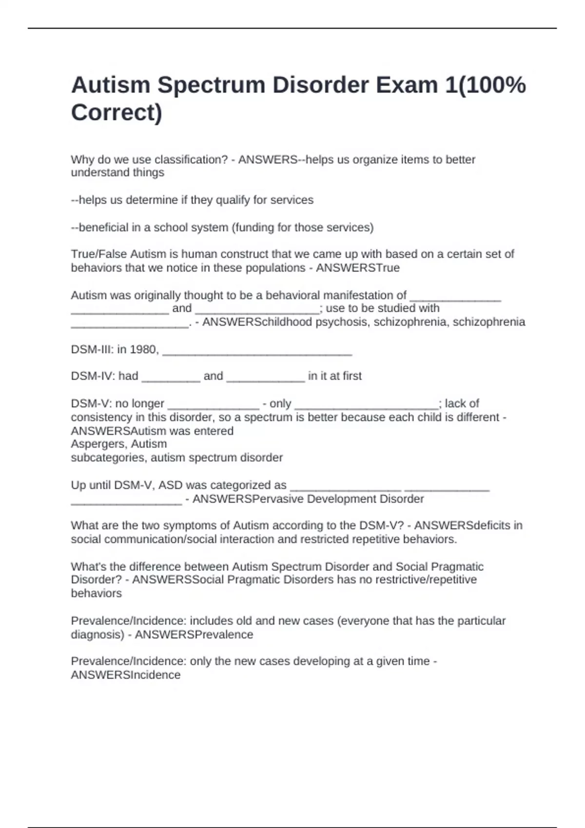 Why do we use classification? - ANSWERS--helps us organize items to better understand things --helps us determine if they qualify for services --beneficial in a school system (funding for those services) True/False Autism is human construct that we came up with based on a certain set of behaviors that we notice in these populations - ANSWERSTrue Autism was originally thought to be a behavioral manifestation of ______________ _______________ and ___________________; use to be studied with __________________. - ANSWERSchildhood psychosis, schizophrenia, schizophrenia DSM-III: in 1980, _____________________________ DSM-IV: had _________ and ____________ in it at first DSM-V: no longer ______________ - only ______________________; lack of consistency in this disorder, so a spectrum is better because each child is different - ANSWERSAutism was entered Aspergers, Autism subcategories, autism spectrum disorder Up until DSM-V, ASD was categorized as _________________ _____________ _________________ - ANSWERSPervasive Development Disorder