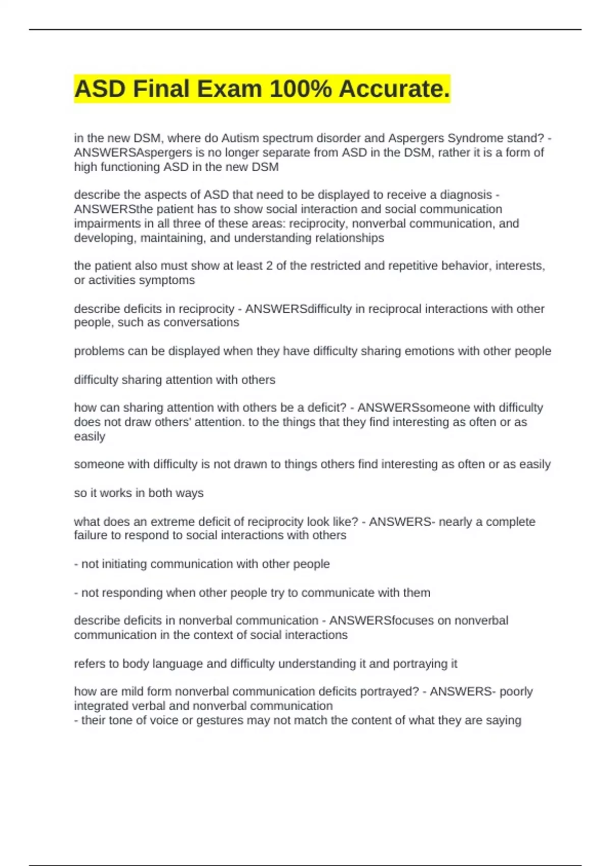in the new DSM, where do Autism spectrum disorder and Aspergers Syndrome stand? - ANSWERSAspergers is no longer separate from ASD in the DSM, rather it is a form of high functioning ASD in the new DSM describe the aspects of ASD that need to be displayed to receive a diagnosis - ANSWERSthe patient has to show social interaction and social communication impairments in all three of these areas: reciprocity, nonverbal communication, and developing, maintaining, and understanding relationships the patient also must show at least 2 of the restricted and repetitive behavior, interests, or activities symptoms describe deficits in reciprocity - ANSWERSdifficulty in reciprocal interactions with other people, such as conversations problems can be displayed when they have difficulty sharing emotions with other people difficulty sharing attention with others how can sharing attention with others be a deficit? - ANSWERSsomeone with difficulty does not draw others' attention. to the things that they find interesting as often or as easily someone with difficulty is not drawn to things others find interesting as often or as easily