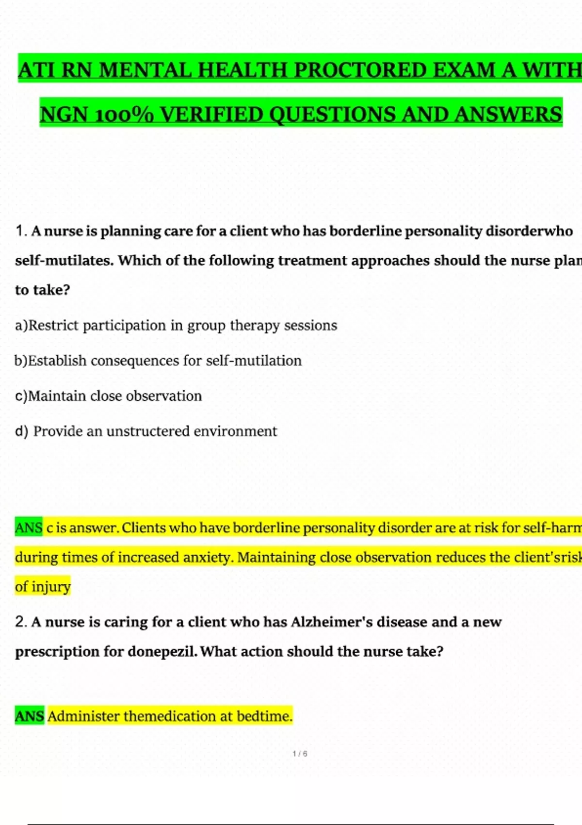 ATI RN MENTAL HEALTH PROCTORED EXAM A WITH 100% VERIFIED QUESTIONS AND ANSWERS ( V4 )