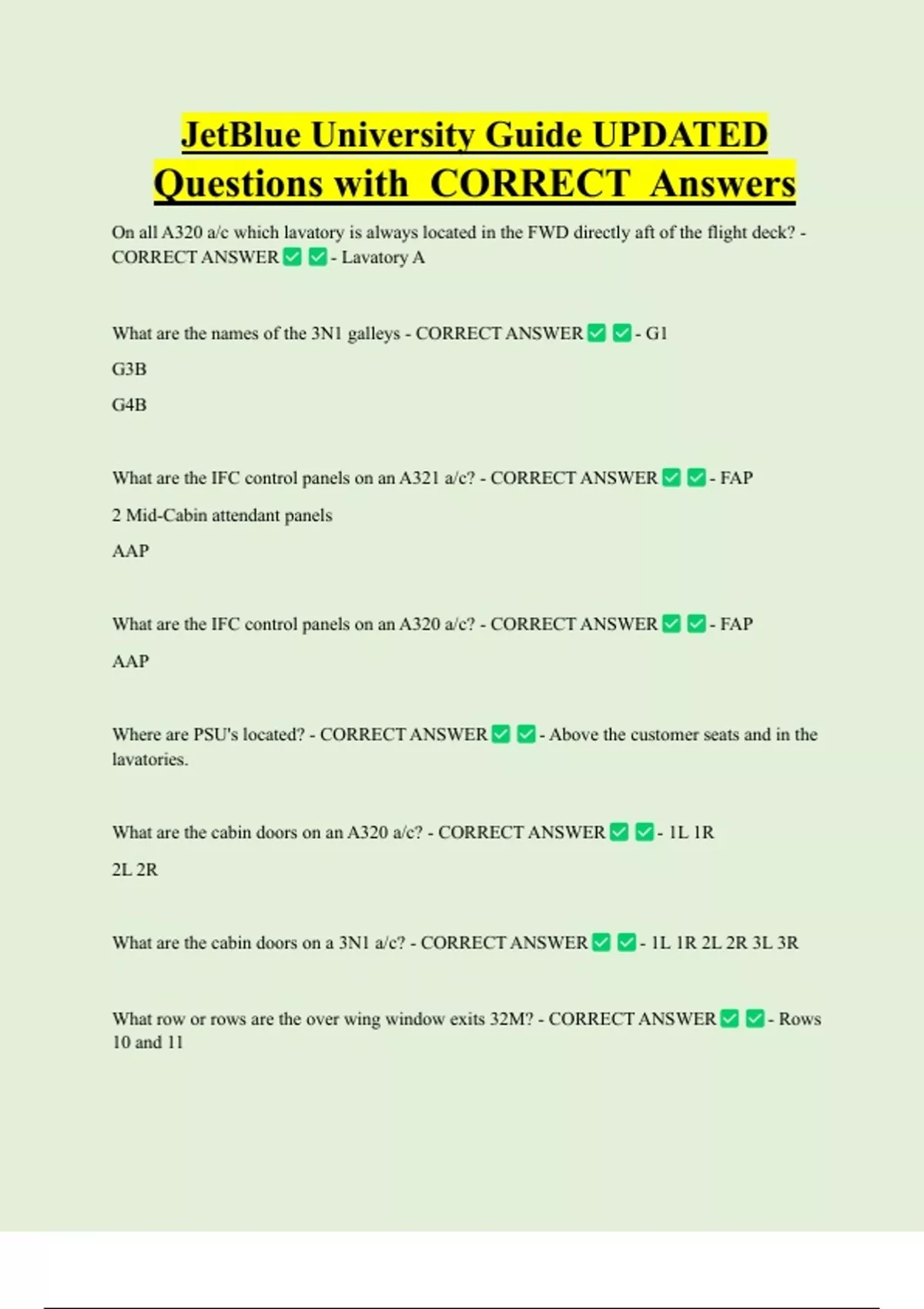 JetBlue University Guide UPDATED Questions with CORRECT Answers On all A320 a/c which lavatory is always located in the FWD directly aft of the flight deck? - CORRECT ANSWER - Lavatory A What are the names of the 3N1 galleys - CORRECT ANSWER - G1 G3B G4B