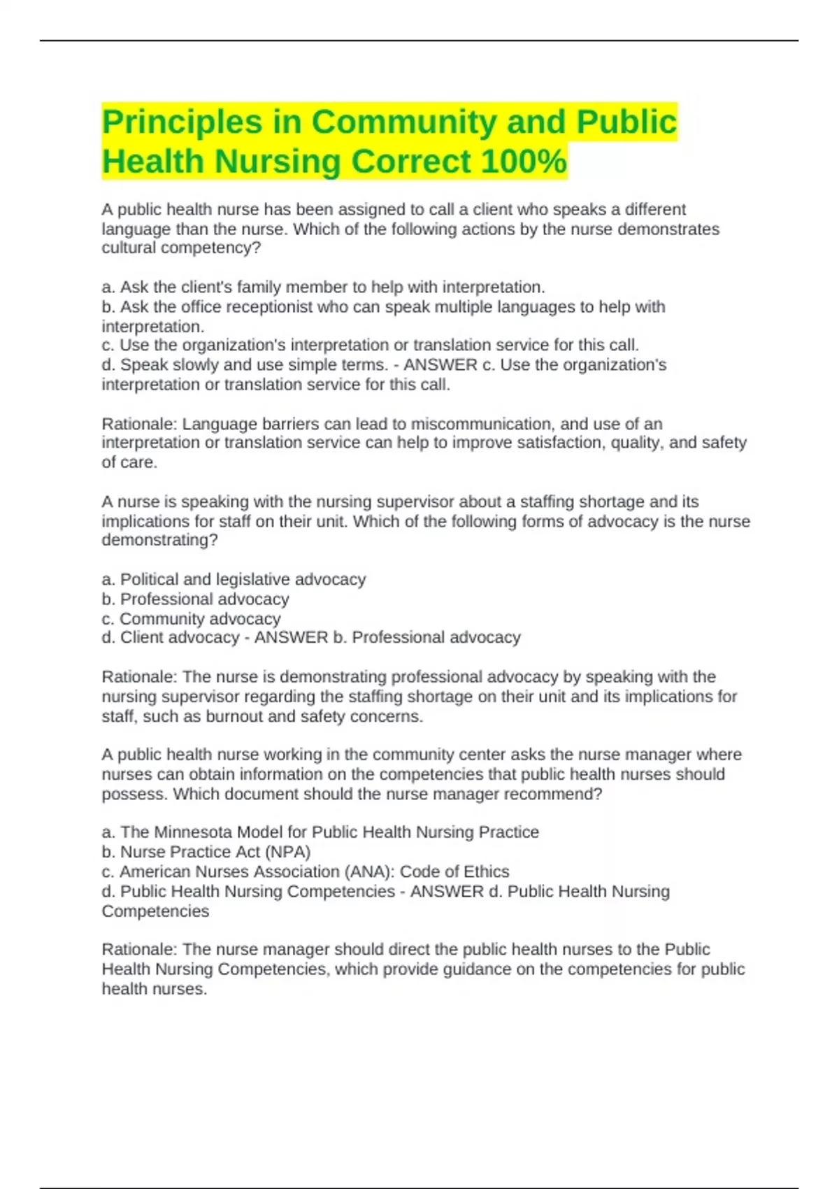 A public health nurse has been assigned to call a client who speaks a different language than the nurse. Which of the following actions by the nurse demonstrates cultural competency? a. Ask the client's family member to help with interpretation. b. Ask the office receptionist who can speak multiple languages to help with interpretation. c. Use the organization's interpretation or translation service for this call. d. Speak slowly and use simple terms. - ANSWER c. Use the organization's interpretation or translation service for this call. Rationale: Language barriers can lead to miscommunication, and use of an interpretation or translation service can help to improve