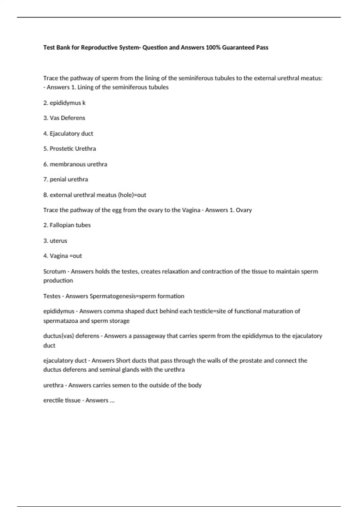 Test Bank for Reproductive System- Question and Answers 100% Guaranteed Pass Trace the pathway of sperm from the lining of the seminiferous tubules to the external urethral meatus: - Answers 1. Lining of the seminiferous tubules 2. epididymus k 3. Vas Deferens 4. Ejaculatory duct 5. Prostetic Urethra 6. membranous urethra 7. penial urethra 8. external urethral meatus (hole)=out Trace the pathway of the egg from the ovary to the Vagina - Answers 1. Ovary 2. Fallopian tubes 3. uterus 4. Vagina =out Scrotum - Answers holds the testes, creates relaxation and contraction of the tissue to maintain sperm production Testes - Answers Spermatogenesis=sperm formation epididymus - Answers comma shaped duct behind each testicle=site of functional maturation of spermatazoa and sperm storage ductus(vas) deferens - Answers a passageway that carries sperm from the epididymus to the ejaculatory duct ejaculatory duct - Answers Short ducts that pass through the walls of the prostate and connect the ductus deferens and seminal glands with the urethra urethra - Answers carries semen to the outside of the body erectile tissue - Answers ... seminal vessicles - Answers adds secretion to the semen; adds fibrinogen(clotting factor), fructose(sugar=food supply of sperm) and prostaglandins(Inflammation to protect the sperm from the vaginas hostile acid)=alters metabolic activity prostate gland - Answers accessory gland pf male repro tract that produces semen (approx. 1/3 of volume) secretes prostatic fluid=slightly acidic. the fluid contains antibiotic properties to help fight infection bulbo-urethral gland (cowpers gland) - Answers spherical strucutres, these glands secrete a thick alkaline fluid that helps neutralize urinary acids in the urethra and lubricates the glans or tip of the penis. Penis - Answers erectile organ through which the distal urethra passes through Root=attatched to body, Body=shaft, Glans Penis=head of the penis Semen - Answers Mixture of sperm and secretions from glands slightly alkaline pH contains 50-150 million sperm/ml spermatic cord - Answers contains blood vessels, nerves and vas deferens FSH - Answers follicle stimulating hormone=increased sperm production LH - Answers luteinizing hormone=matures sperm and stimulates testes to secrete testosterone Androgen (testosterone) and DTH functions: (4): - Answers 1. Development=from embryo to fetus and helps mature sperm 2. Sexual Characteristics=muscle mass, hair, depositum 3. Sexual Functions=^ sex drive 4. Metabolism =^metabolism Gametes - Answers sex cells (eggs and sperm) Gonads - Answers sex organs=ovaries and testies interstitial cells - Answers secrete testosterone nurse cells - Answers caretakers of the sperm=nourishment and maturation of sperm Ovaries - Answers where eggs are made and stored ovarian follicles - Answers contain the developing oocyte Graafian Follicle - Answers "mature follicle" =ruptures off the egg from the ovary