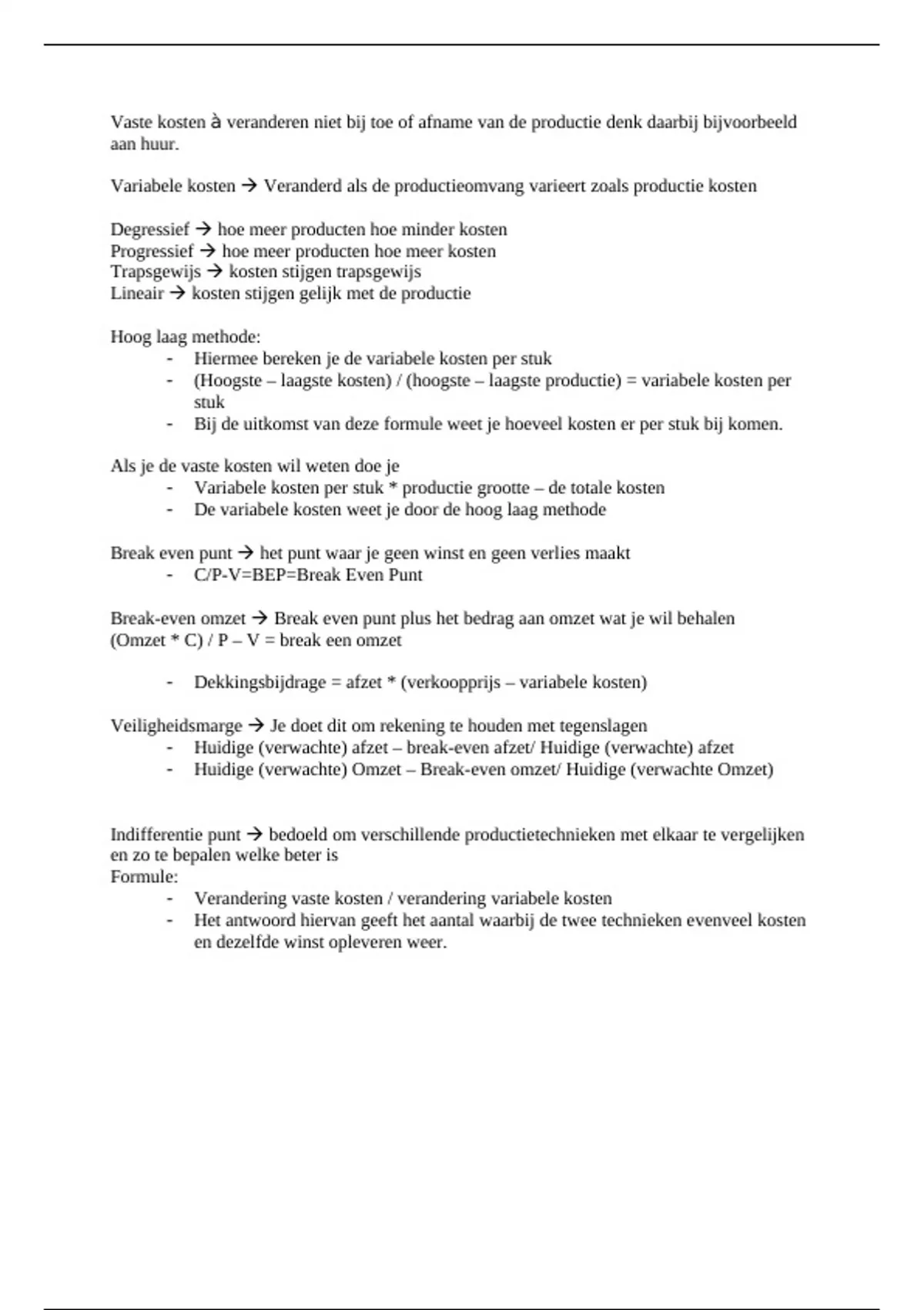 - (Hoogste – laagste kosten) / (hoogste – laagste productie) = variabele kosten per