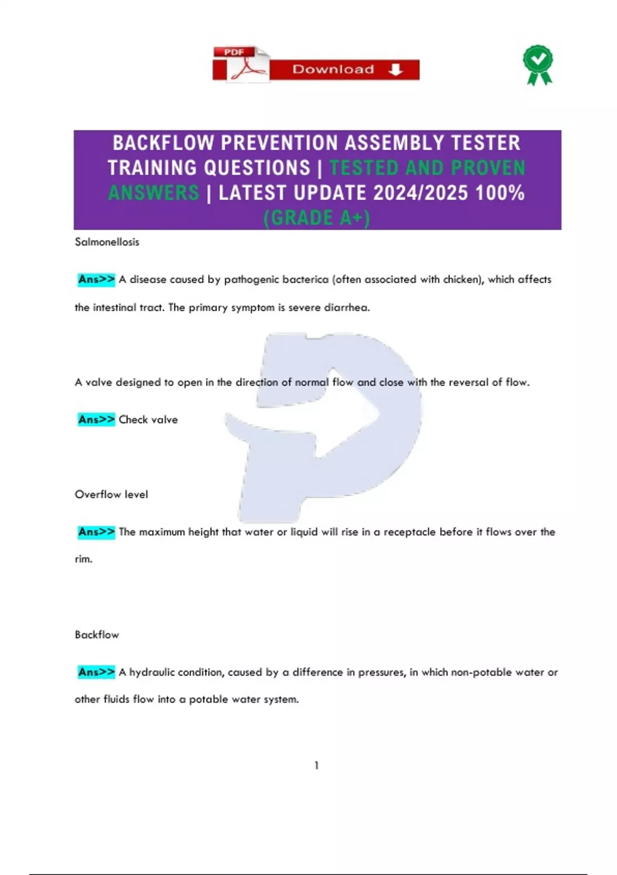 BACKFLOW PREVENTION ASSEMBLY TESTER TRAINING QUESTIONS | TESTED AND PROVEN ANSWERS | LATEST UPDATE 2024/2025 100% (GRADE A+)BACKFLOW PREVENTION ASSEMBLY TESTER TRAINING QUESTIONS | TESTED AND PROVEN ANSWERS | LATEST UPDATE 2024/2025 100% (GRADE A+)