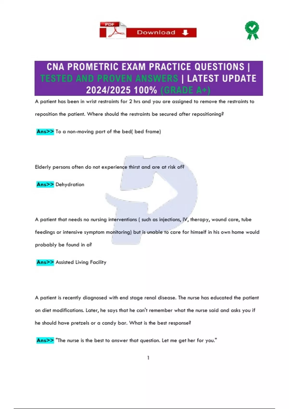 CNA PROMETRIC EXAM PRACTICE QUESTIONS | TESTED AND PROVEN ANSWERS | LATEST UPDATE 2024/2025 100% (GRADE A+) CNA PROMETRIC EXAM PRACTICE QUESTIONS | TESTED AND PROVEN ANSWERS | LATEST UPDATE 2024/2025 100% (GRADE A+)