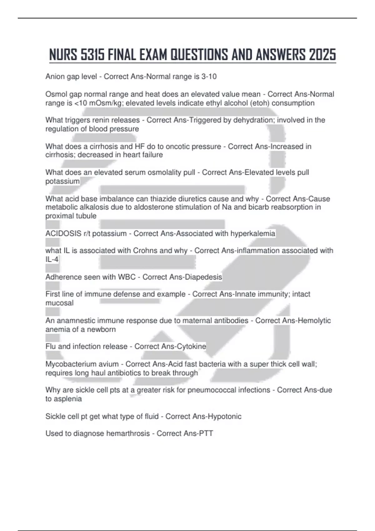 Anion gap level - Correct Ans-Normal range is 3-10 Osmol gap normal range and heat does an elevated value mean - Correct Ans-Normal range is <10 mOsm/kg; elevated levels indicate ethyl alcohol (etoh) consumption What triggers renin releases - Correct Ans-Triggered by dehydration; involved in the regulation of blood pressure What does a cirrhosis and HF do to oncotic pressure - Correct Ans-Increased in cirrhosis; decreased in heart failure What does an elevated serum osmolality pull - Correct Ans-Elevated levels pull potassium What acid base imbalance can thiazide diuretics cause and why - Correct Ans-Cause metabolic alkalosis due to aldosterone stimulation of Na and bicarb reabsorption in proximal tubule ACIDOSIS r/t potassium - Correct Ans-Associated with hyperkalemia what IL is associated with Crohns and why - Correct Ans-inflammation associated with IL-4 Adherence seen with WBC - Correct Ans-Diapedesis First line of immune defense and example - Correct Ans-Innate immunity; intact mucosal An anamnestic immune response due to maternal antibodies - Correct Ans-Hemolytic anemia of a newborn Flu and infection release - Correct Ans-Cytokine Mycobacterium avium - Correct Ans-Acid fast bacteria with a super thick cell wall; requires long haul antibiotics to break through Why are sickle cell pts at a greater risk for pneumococcal infections - Correct Ans-due to asplenia Sickle cell pt get what type of fluid - Correct Ans-Hypotonic Used to diagnose hemarthrosis - Correct Ans-PTT Iron deficit is common in - Correct Ans-Common in childbearing age Hodgkin's lymphoma CM - Correct Ans-Reed Sternberg cells, weight loss, night sweats, enlarged mass on right side of neck Leukemia causes what platelet change - Correct Ans-Causes thrombocytopenia Pulmonary resistance is equal to adults at X weeks - Correct Ans-Equal to adults at 8 weeks Causes loss of atrial kick, resulting in lack of cardiac output and potential syncope - Correct Ans-A-fib Can cause pulmonary edema; hypertrophy is not acute during surgery - Correct Ans-Aortic stenosis Community-acquired pneumonia is caused by - Correct Ans-Caused by Streptococcus pneumoniae Hypovolemic shock from diarrhea causes pyruvate to produce.... - Correct Ans-Caused by diarrhea, leading to pyruvate production and lactic acidosis Croup often causes by - Correct Ans-Caused by parainfluenza virus Factor V Leiden Mutation often causes - Correct Ans-Causes hypercoagulability and is associated with pulmonary embolism COPD FEV1 - Correct Ans-Characterized by low FEV1 Takes weeks to develop and is seen in elderly individuals who fall - Correct Ans-Subdural hematoma Fontanels are not all closed until - Correct Ans-Do not close until 18 months Cerebral palsy causes - Correct Ans-Caused by injury or abnormal brain development; hemorrhage during birth can be a cause Responsible for lack of coordination - Correct Ans-Cerebellum Subarachnoid can cause irritation to meninges due to contact with ______ - Correct Ans-Pia Decrease cerebral blood flow and glucose metabolism can lead to______ due to_______ - Correct Ans-Can lead to depression due to decreased 5-HT Addison's - Correct Ans-Hypofunction of adrenal cortex; lack of aldosterone and cortisol