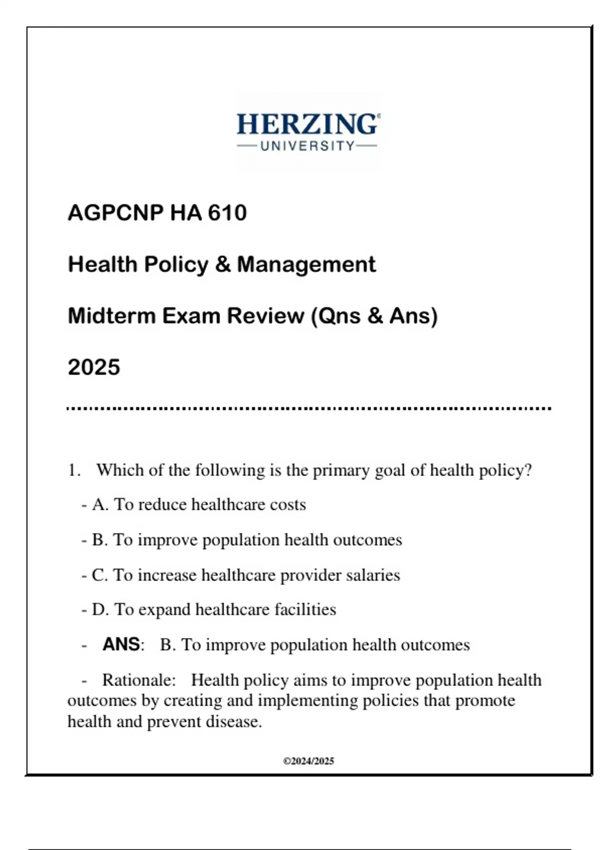 HA 610 (HU-AGPCNP) Health Policy & Management Midterm Exam (Qns & Ans) 2025HA 610 (HU-AGPCNP) Health Policy & Management Midterm Exam (Qns & Ans) 2025HA 610 (HU-AGPCNP) Health Policy & Management Midterm Exam (Qns & Ans) 2025