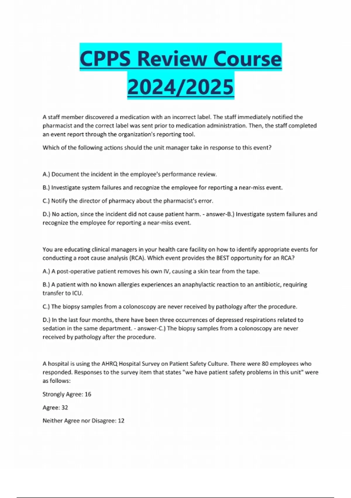 CPPS Review Course 2024/2025 A staff member discovered a medication with an incorrect label. The staff immediately notified the pharmacist and the correct label was sent prior to medication administration. Then, the staff completed an event report through the organization's reporting tool. Which of the following actions should the unit manager take in response to this event? A.) Document the incident in the employee's performance review. B.) Investigate system failures and recognize the employee for reporting a near-miss event. C.) Notify the director of pharmacy about the pharmacist's error. D.) No action, since the incident did not cause patient harm. - answer-B.) Investigate system failures and recognize the employee for reporting a near-miss event. You are educating clinical managers in your health care facility on how to identify appropriate events for conducting a root cause analysis (RCA). Which event provides the BEST opportunity for an RCA? A.) A post-operative patient removes his own IV, causing a skin tear from the tape. B.) A patient with no known allergies experiences an anaphylactic reaction to an antibiotic, requiring transfer to ICU. C.) The biopsy samples from a colonoscopy are never received by pathology after the procedure. D.) In the last four months, there have been three occurrences of depressed respirations related to sedation in the same department. - answer-C.) The biopsy samples from a colonoscopy are never received by pathology after the procedure. A hospital is using the AHRQ Hospital Survey on Patient Safety Culture. There were 80 employees who responded. Responses to the survey item that states "we have patient safety problems in this unit" were as follows: Strongly Agree: 16 Agree: 32 Neither Agree nor Disagree: 12