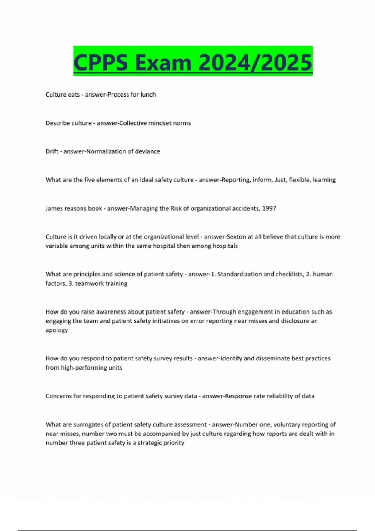 CPPS Exam 2024/2025 Culture eats - answer-Process for lunch Describe culture - answer-Collective mindset norms Drift - answer-Normalization of deviance What are the five elements of an ideal safety culture - answer-Reporting, inform, Just, flexible, learning James reasons book - answer-Managing the Risk of organizational accidents, 1997 Culture is it driven locally or at the organizational level - answer-Sexton at all believe that culture is more variable among units within the same hospital then among hospitals What are principles and science of patient safety - answer-1. Standardization and checklists, 2. human factors, 3. teamwork training How do you raise awareness about patient safety - answer-Through engagement in education such as engaging the team and patient safety initiatives on error reporting near misses and disclosure an apology How do you respond to patient safety survey results - answer-Identify and disseminate best practices from high-performing units Concerns for responding to patient safety survey data - answer-Response rate reliability of data