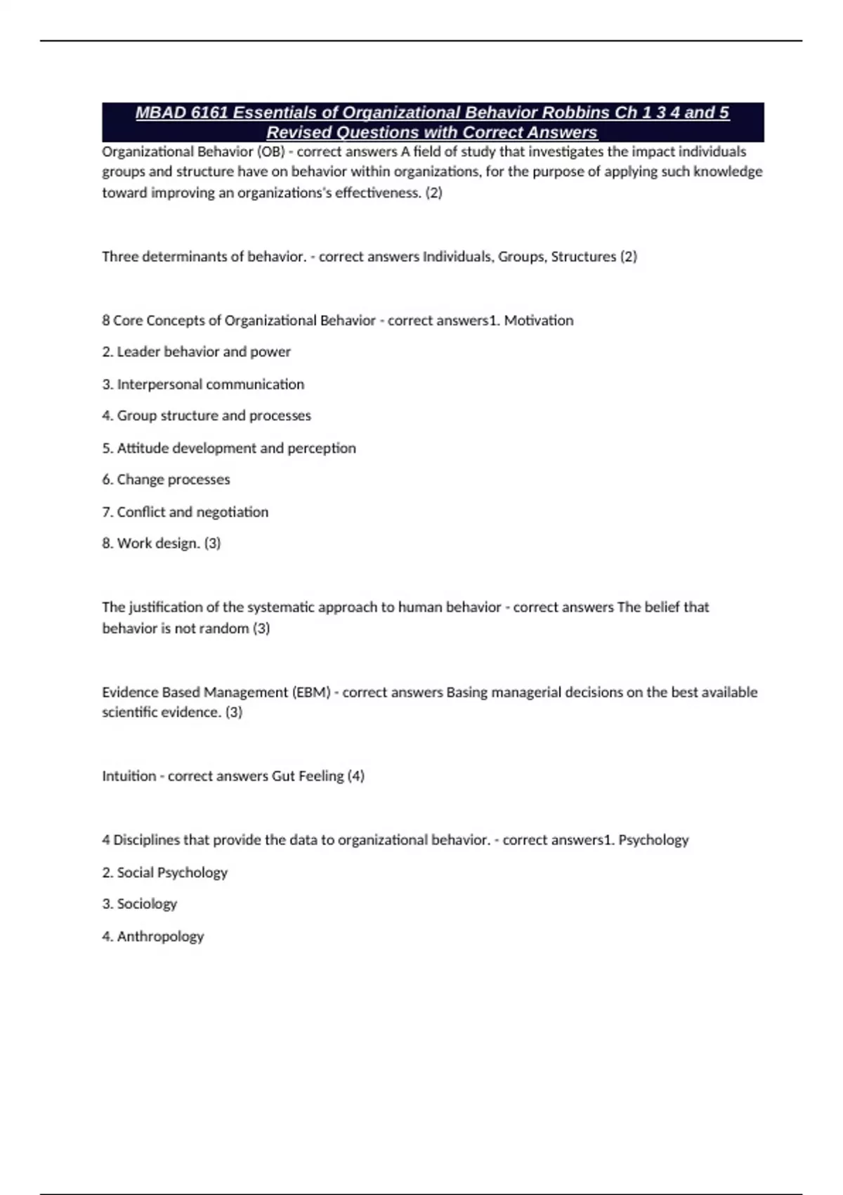 Evidence Based Management (EBM) - correct answers Basing managerial decisions on the best available
