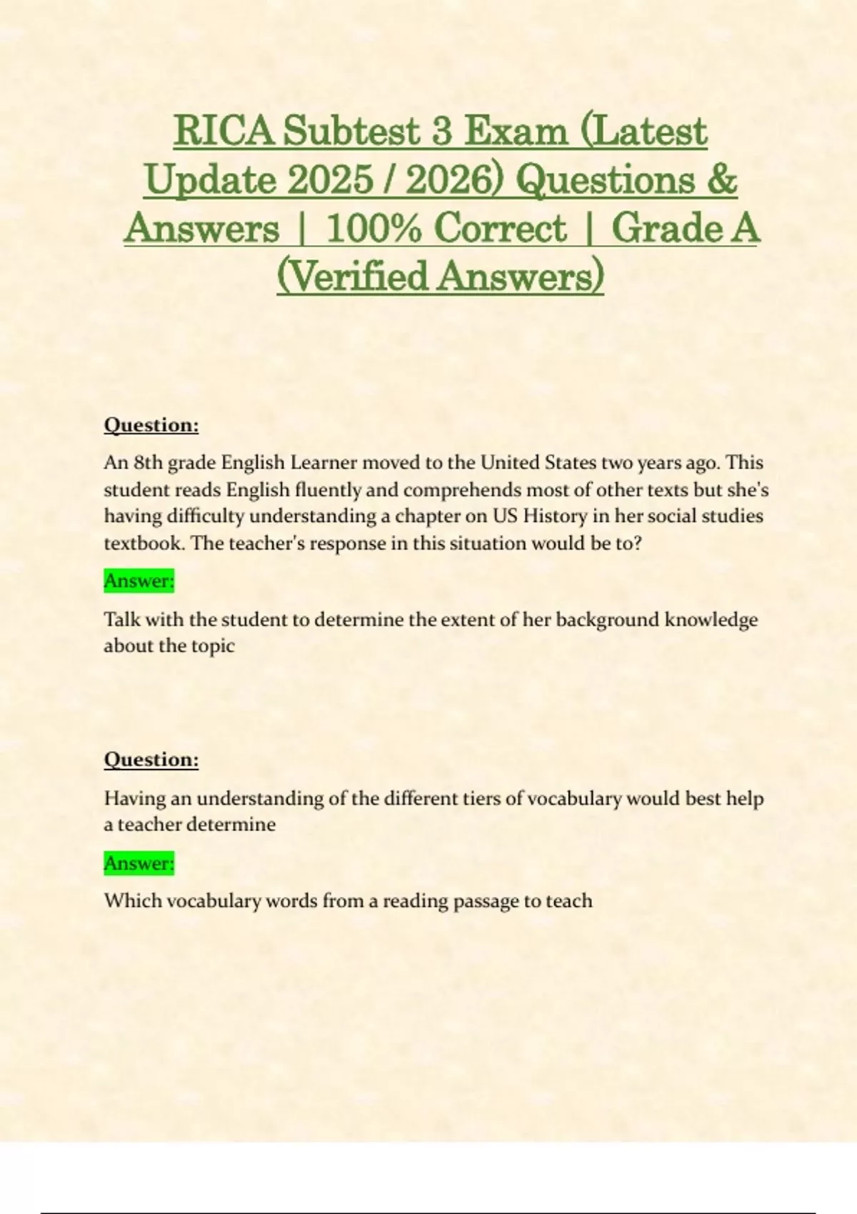 RICA Subtest 3 Exam (Latest Update 2025 / 2026) Questions & Answers | 100% Correct | Grade A (Verified Answers) Question: An 8th grade English Learner moved to the United States two years ago. This student reads English fluently and comprehends most of other texts but she's having difficulty understanding a chapter on US History in her social studies textbook. The teacher's response in this situation would be to? Answer: Talk with the student to determine the extent of her background knowledge about the topic Question: Having an understanding of the different tiers of vocabulary would best help a teacher determine Answer: Which vocabulary words from a reading passage to teach Question: Fourth grade teacher is going to start reading a passage and ask students to make predictions about the text to activate prior knowledge. What should be the next step? Answer: Put the responses into categories (have students put ideas into categories) It was written in a longer way) Question: A third grader is taking a reading assessment and makes one mistake. They pause and self correct their mistakes. The sentence was Tea, is sweeter (sweet) than honey. Or it was "Honey is sweet than jam", after reading she corrects herself and reads it correctly, Honey is sweeter than jam, This shows that the student has an understanding of...... Answer: common English grammatical convention use