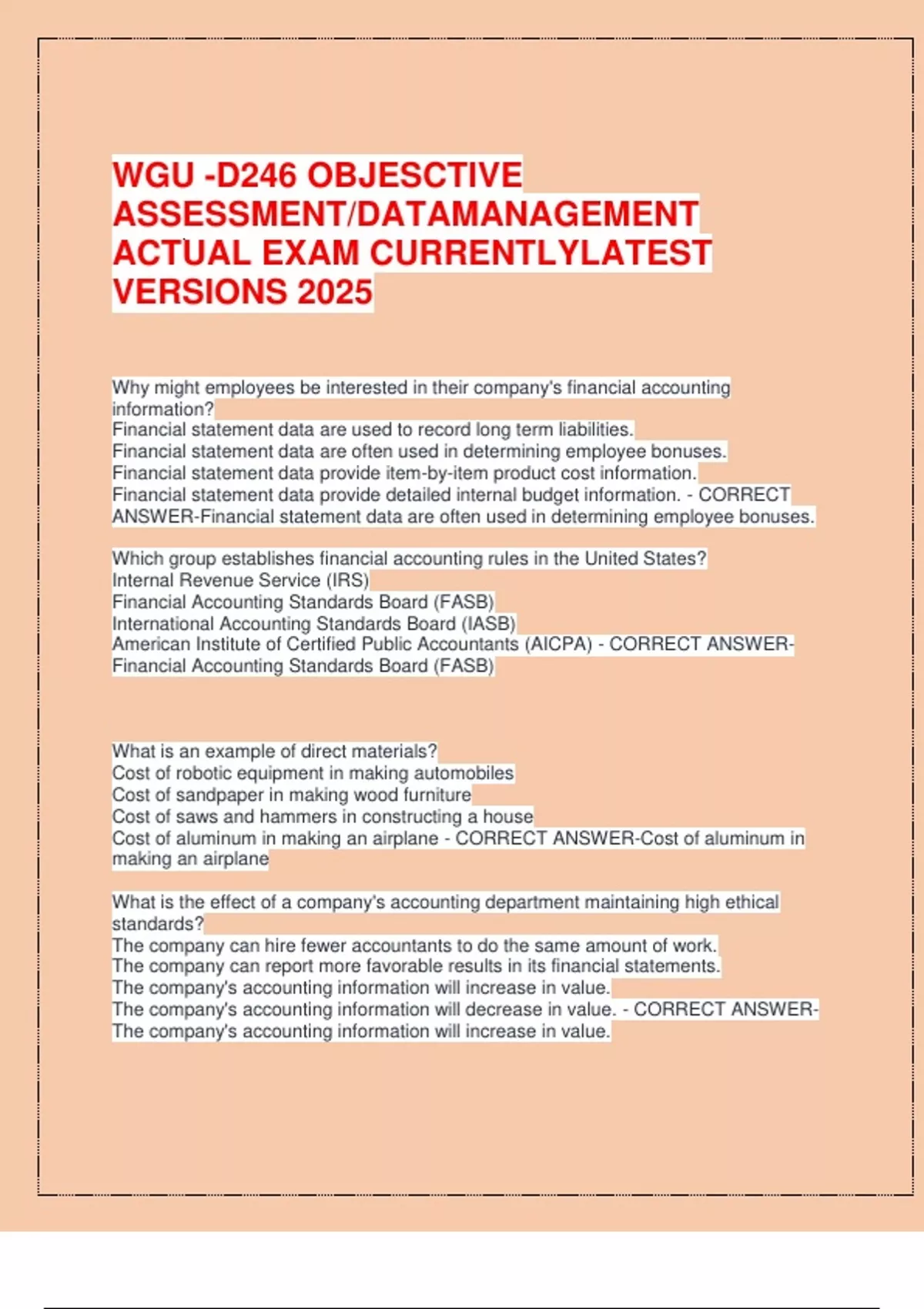WGU -D246 OBJESCTIVE ASSESSMENT/DATAMANAGEMENT ACTUAL EXAM CURRENTLYLATEST VERSIONS 2025