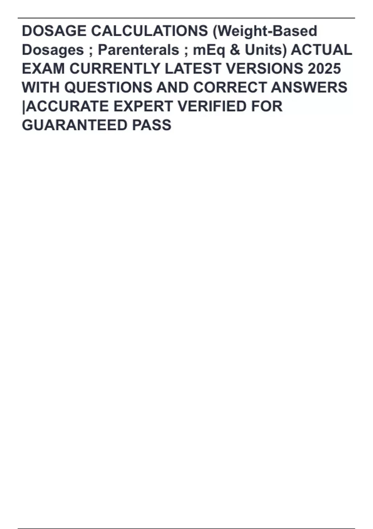 DOSAGE CALCULATIONS (Weight-Based Dosages ; Parenterals ; mEq & Units) ACTUAL EXAM CURRENTLY LATEST VERSIONS 2025 WITH QUESTIONS AND CORRECT ANSWERS |ACCURATE EXPERT VERIFIED FOR GUARANTEED PASS