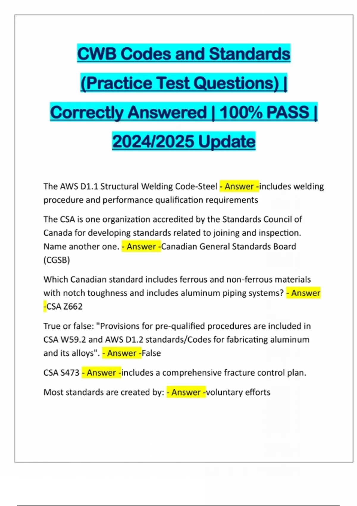 CWB Codes and Standards (Practice Test Questions) | Correctly Answered | 100% PASS | 2024/2025 Update