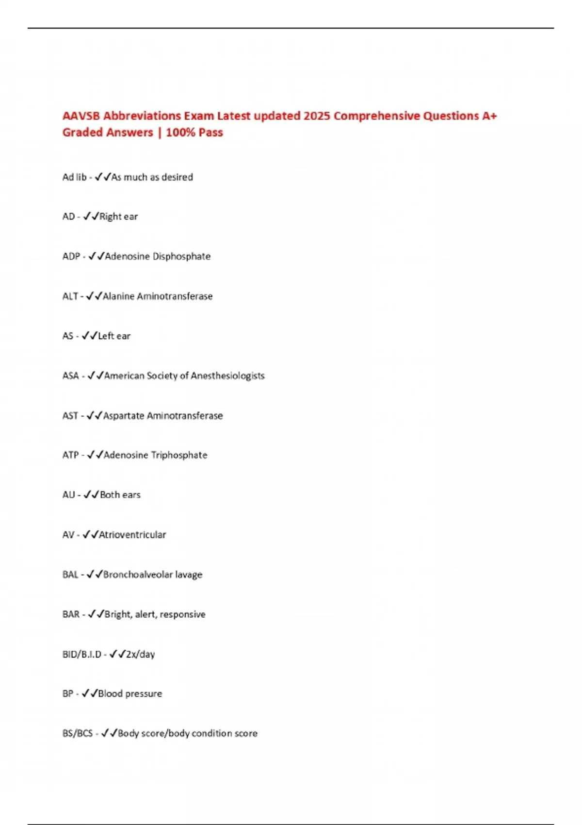 AAVSB Abbreviations Exam Latest updated 2025 Comprehensive Questions A+ Graded Answers | 100% Pass