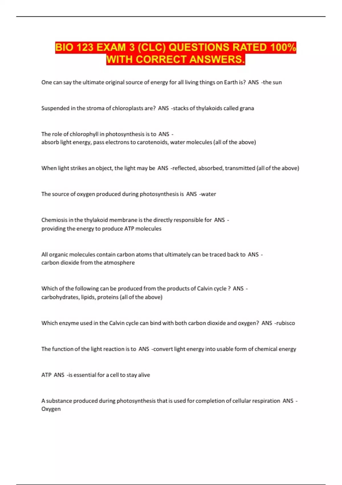 BIO 123 EXAM 3 (CLC) QUESTIONS RATED 100% WITH CORRECT ANSWERS.