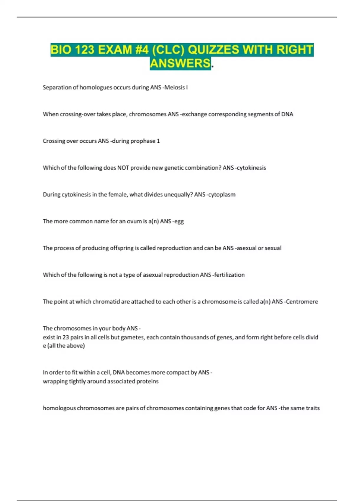 BIO 123 EXAM #4 (CLC) QUIZZES WITH RIGHT ANSWERS.
