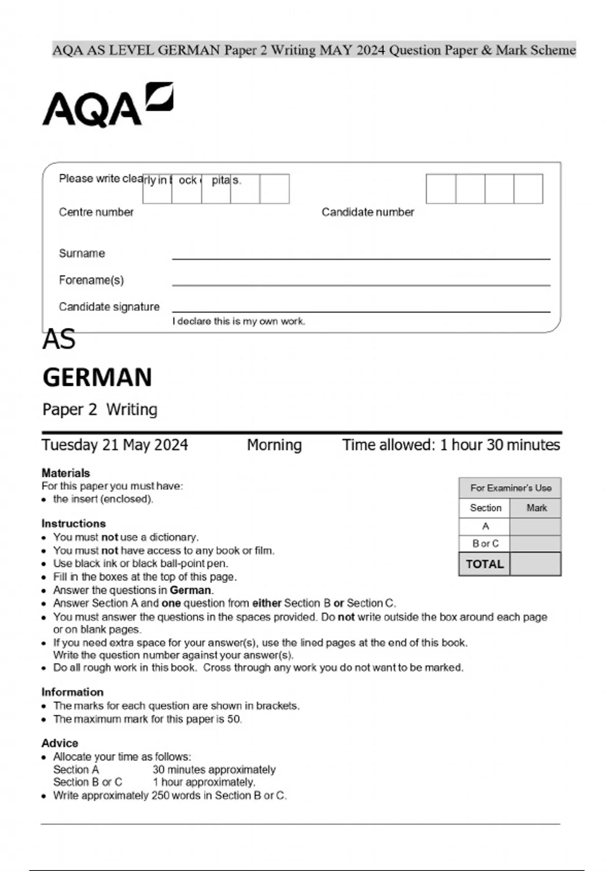 AQA AS LEVEL GERMAN Paper 2 Writing MAY 2024 Question Paper & Mark Scheme