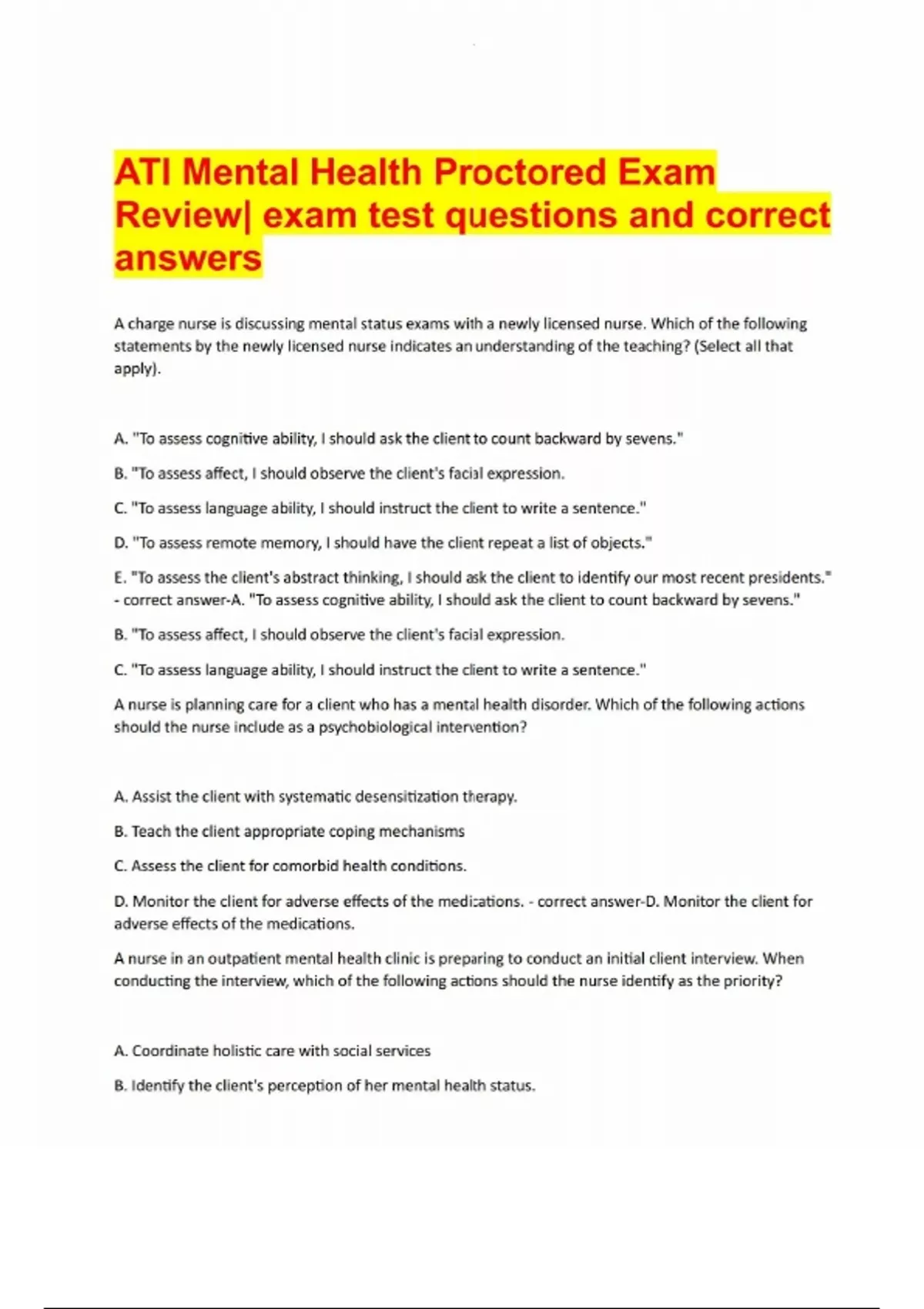 ATI Mental Health Proctored Exam Review exam test questions and correct answers