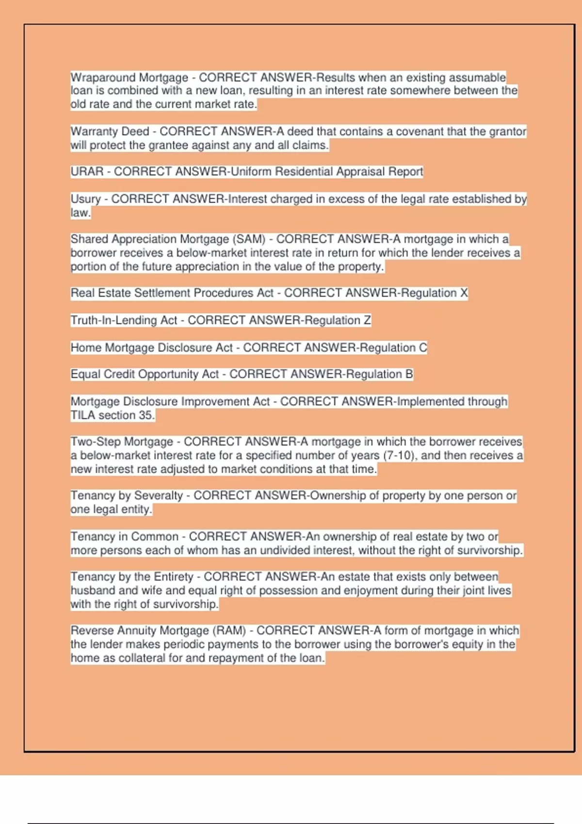 Shared Appreciation Mortgage (SAM) - CORRECT ANSWER-A mortgage in which a