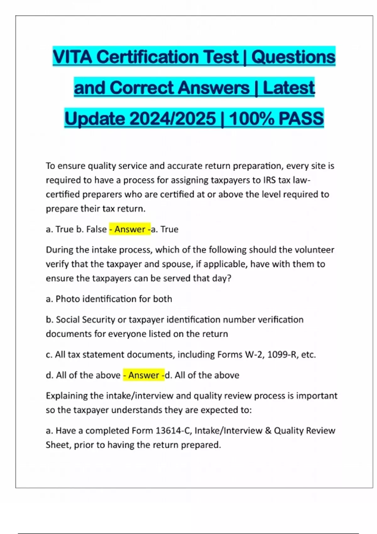 VITA Certification Test | Questions and Correct Answers | Latest Update 2024/2025 | 100% PASS To ensure quality service and accurate return preparation, every site is required to have a process for assigning taxpayers to IRS tax lawcertified preparers who are certified at or above the level required to prepare their tax return. a. True b. False - Answer -a. True During the intake process, which of the following should the volunteer verify that the taxpayer and spouse, if applicable, have with them to ensure the taxpayers can be served that day? a. Photo identification for both b. Social Security or taxpayer identification number verification documents for everyone listed on the return c. All tax statement documents, including Forms W-2, 1099-R, etc. d. All of the above - Answer -d. All of the above Explaining the intake/interview and quality review process is important so the taxpayer understands they are expected to: a. Have a completed Form 13614-C, Intake/Interview & Quality Review Sheet, prior to having the return prepared.b. Answer the tax preparer's additional questions during the interview. c. Participate in the quality review of their tax return. d. All of the above. - Answer -d. All of the above. Jan, a greeter, overheard an IRS tax law-certified volunteer, Jim, trying to sell insurance to a taxpayer he was helping. Jim is an insurance agent in the community. Jan feels like Jim was pushy, made the taxpayer uncomfortable, and violated Voluntee