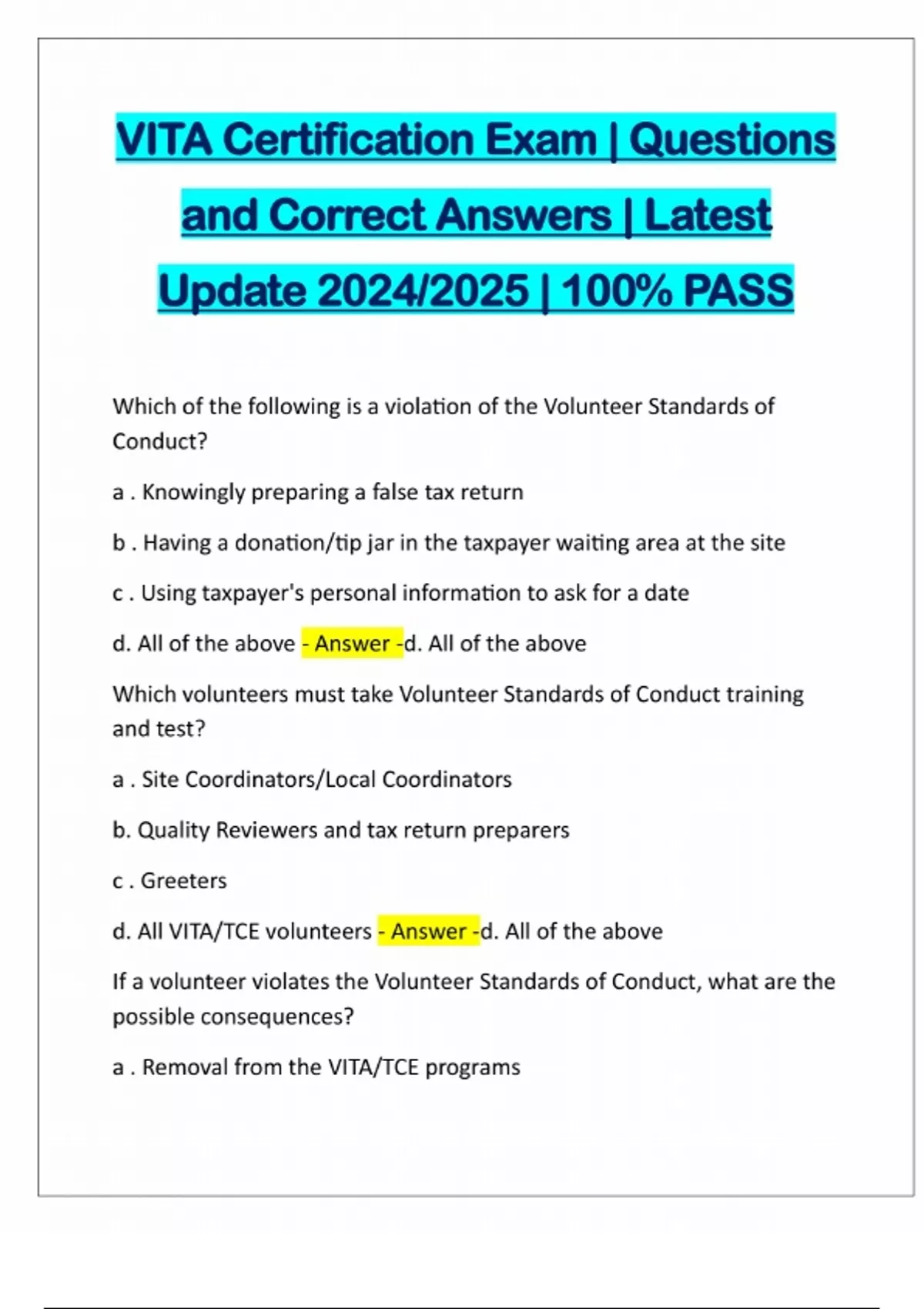 VITA Certification Exam | Questions and Correct Answers | Latest Update 2024/2025 | 100% PASS Which of the following is a violation of the Volunteer Standards of Conduct? a . Knowingly preparing a false tax return b . Having a donation/tip jar in the taxpayer waiting area at the site c . Using taxpayer's personal information to ask for a date d. All of the above - Answer -d. All of the above Which volunteers must take Volunteer Standards of Conduct training and test? a . Site Coordinators/Local Coordinators b. Quality Reviewers and tax return preparers c . Greeters d. All VITA/TCE volunteers - Answer -d. All of the above If a volunteer violates the Volunteer Standards of Conduct, what are the possible consequences? a . Removal from the VITA/TCE programsb . Criminal investigation c . Elimination of VITA/TCE grant funds d . Deactivation of EFIN e. All of the above - Answer -e. all of