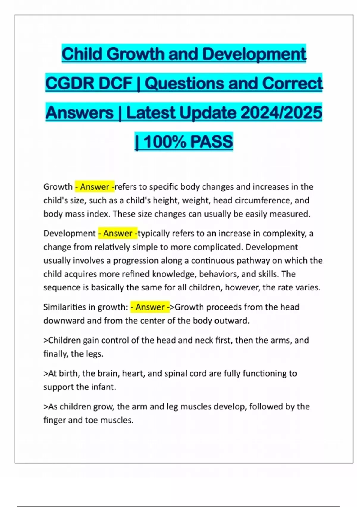 Child Growth and Development CGDR DCF | Questions and Correct Answers | Latest Update 2024/2025 | 100% PASS Growth - Answer -refers to specific body changes and increases in the child's size, such as a child's height, weight, head circumference, and body mass index. These size changes can usually be easily measured. Development - Answer -typically refers to an increase in complexity, a change from relatively simple to more complicated. Development usually involves a progression along a continuous pathway on which the child acquires more refined knowledge, behaviors, and skills. The sequence is basically the same for all children, however, the rate varies. Similarities in growth: - Answer ->Growth proceeds from the head downward and from the center of the body outward. >Children gain control of the head and neck first, then the arms, and finally, the legs. >At birth, the brain, heart, and spinal cord are fully functioning to support the infant. >As children grow, the arm and leg muscles develop, followed by the finger and toe muscles.Differences in growth: - Answer ->Some children are taller, some shorter. Some children are smaller, while others are larger. >These differences are completely typical. Typical growth is supported by good nutrition, adequate sleep, and regular exercise. >Children do not grow at perfectly steady rates throughout childhood. >Children will experience weeks or months of sli