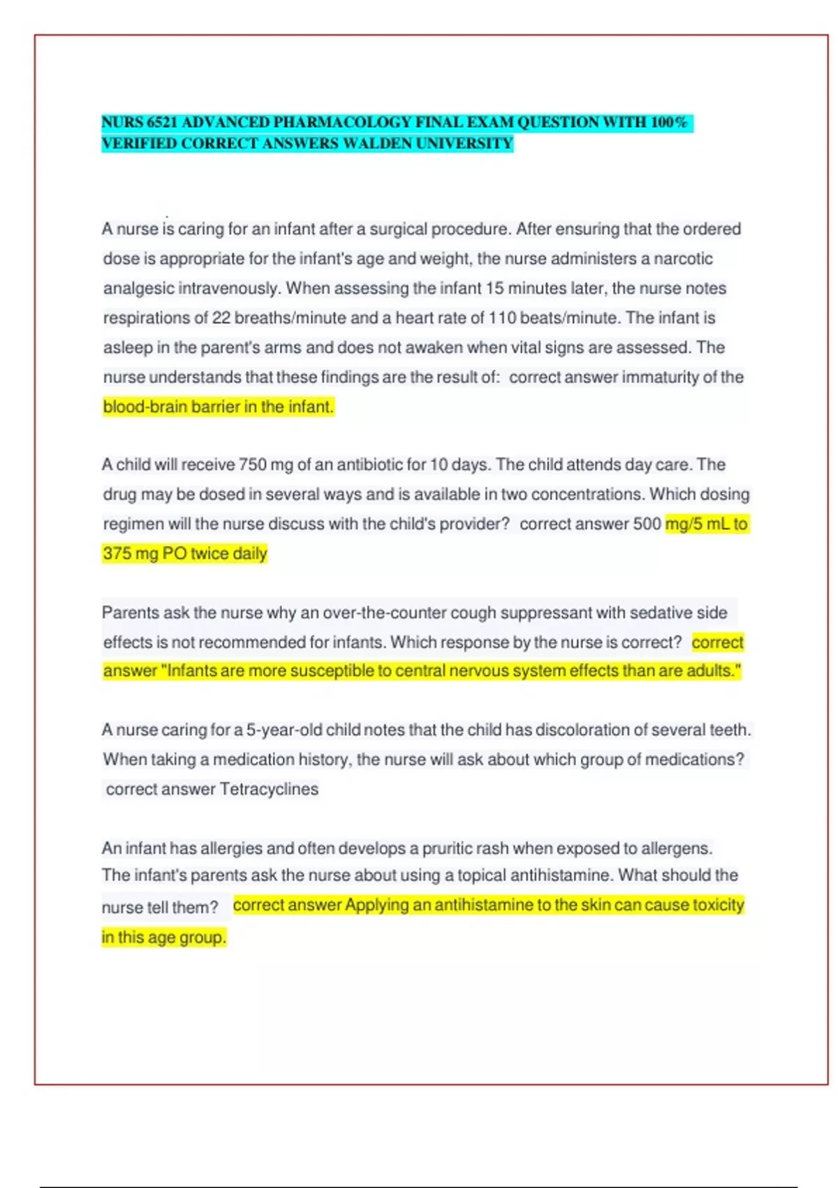 NURS 6521 ADVANCED PHARMACOLOGY FINAL EXAM QUESTION WITH 100% VERIFIED CORRECT ANSWERS WALDEN UNIVERSITY