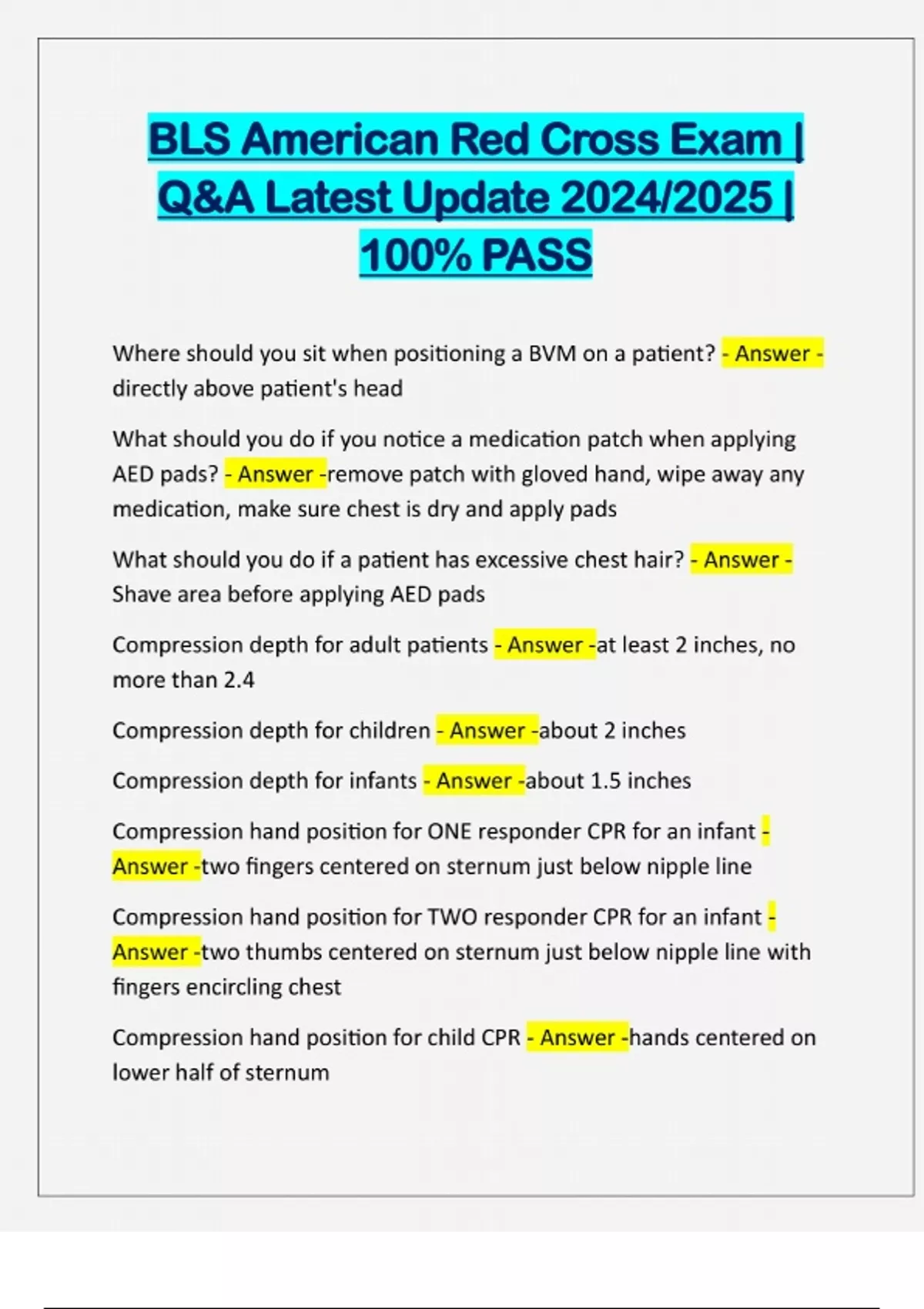 BLS American Red Cross Exam | Q&A Latest Update 2024/2025 | 100% PASS Where should you sit when positioning a BVM on a patient? - Answer - directly above patient's head What should you do if you notice a medication patch when applying AED pads? - Answer -remove patch with gloved hand, wipe away any medication, make sure chest is dry and apply pads What should you do if a patient has excessive chest hair? - Answer - Shave area before applying AED pads Compression depth for adult patients - Answer -at least 2 inches, no more than 2.4 Compression depth for children - Answer -about 2 inches Compression depth for infants - Answer -about 1.5 inches Compression hand position for ONE responder CPR for an infant - Answer -two fingers centered on sternum just below nipple line Compression hand position for TWO responder CPR for an infant - Answer -two thumbs centere