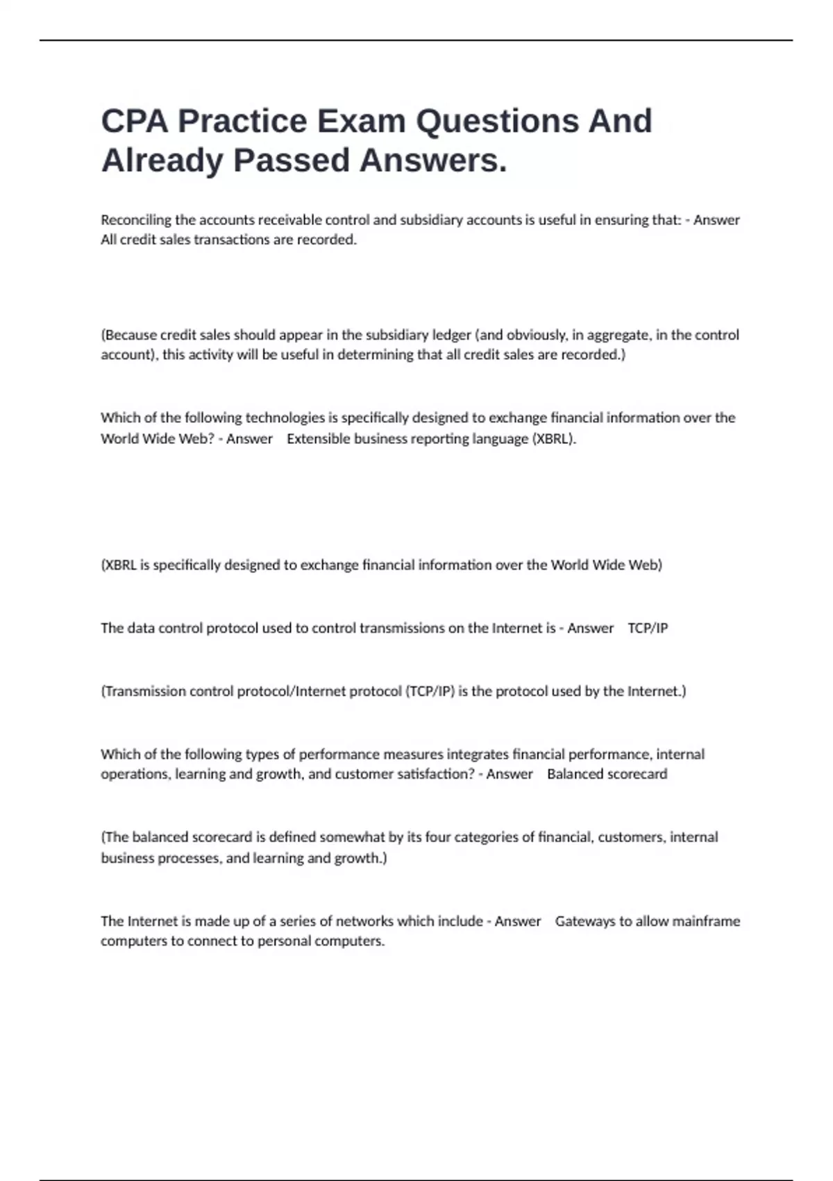 Reconciling the accounts receivable control and subsidiary accounts is useful in ensuring that: - Answer All credit sales transactions are recorded. (Because credit sales should appear in the subsidiary ledger (and obviously, in aggregate, in the control account), this activity will be useful in determining that all credit sales are recorded.) Which of the following technologies is specifically designed to exchange financial information over the World Wide Web? - Answer Extensible business reporting language (XBRL). (XBRL is specifically designed to exchange financial information over the World Wide Web) The data control protocol used to control transmissions on the Internet is - Answer TCP/IP (Transmission control protocol/Internet protocol (TCP/IP) is the protocol used by the Internet.) Which of the following types of performance measures integrates financial performance, internal operations, learning and growth, and customer satisfaction? - Answer Balanced scorecard (The balanced scorecard is defined somewhat by its four categories of financial, customers, internal business processes, and learning and growth.) The Internet is made up of a series of networks which include - Answer Gateways to allow mainframe computers to connect to personal computers.