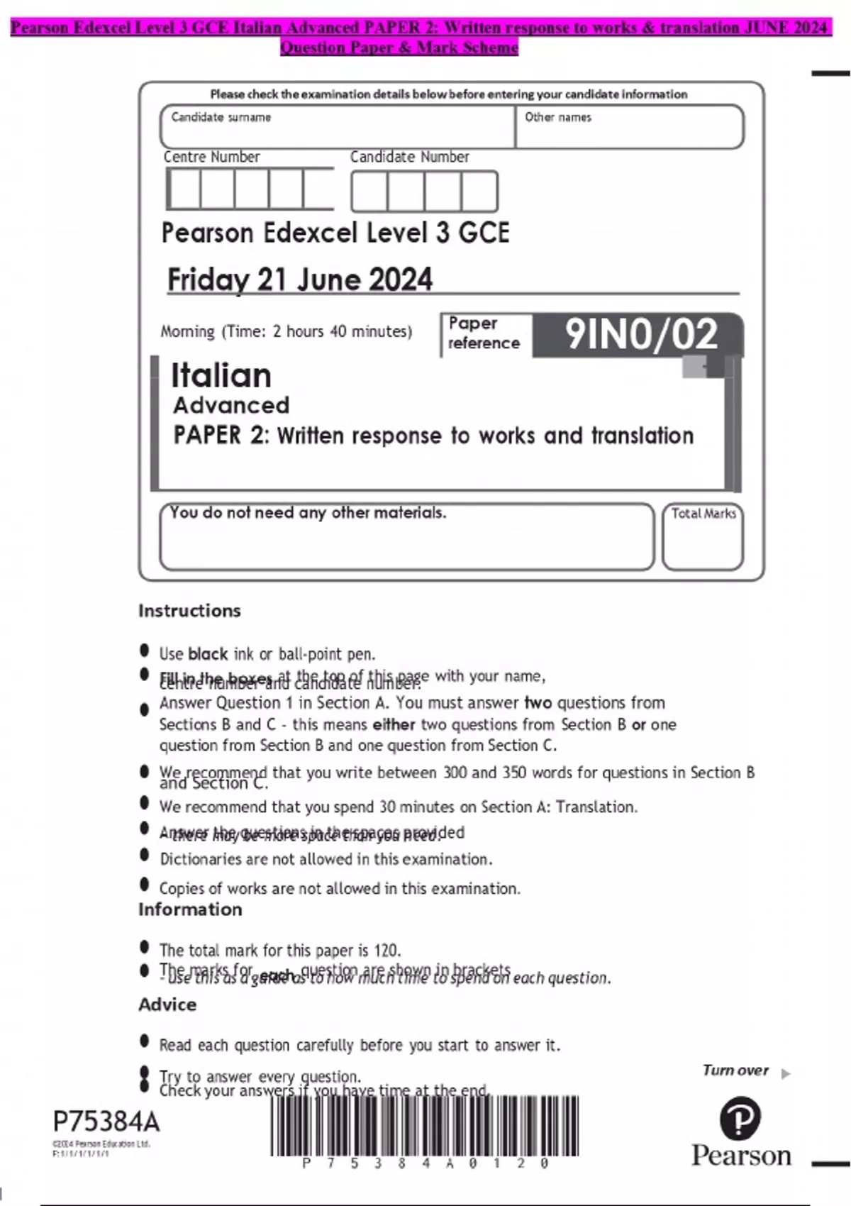 Pearson Edexcel Level 3 GCE Italian Advanced PAPER 2: Written response to works & translation JUNE 2024 Question Paper & Mark Scheme