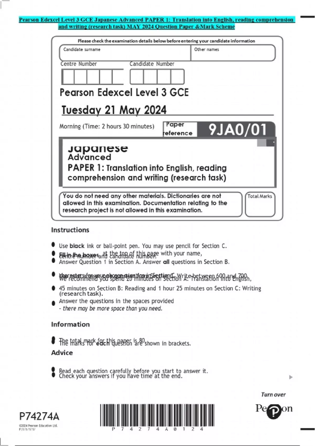 Pearson Edexcel Level 3 GCE Japanese Advanced PAPER 1: Translation into English, reading comprehension and writing (research task) MAY 2024 Question Paper &Mark Scheme