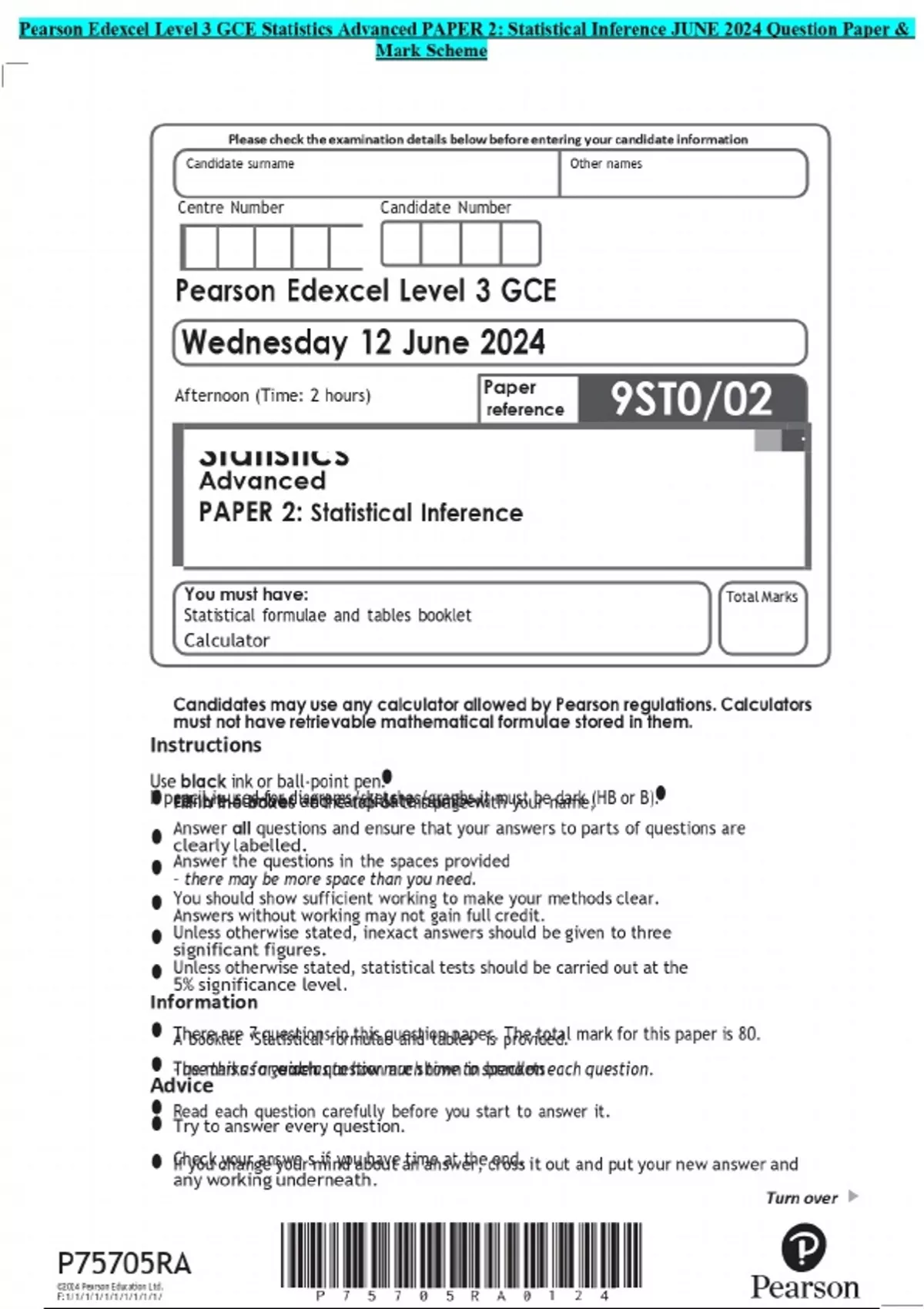 Pearson Edexcel Level 3 GCE Statistics Advanced PAPER 2: Statistical Inference JUNE 2024 Question Paper & Mark Scheme