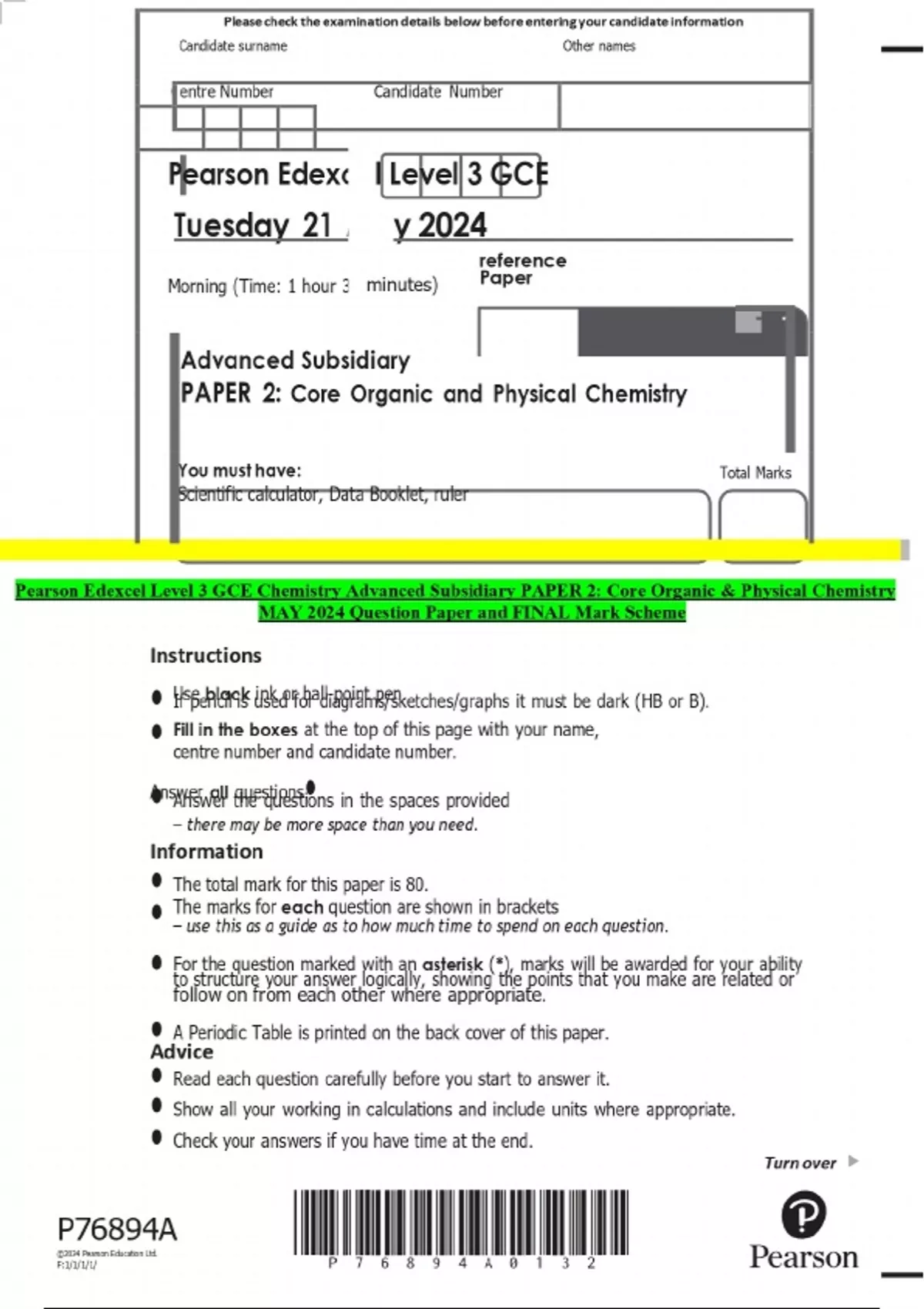 Pearson Edexcel Level 3 GCE Chemistry Advanced Subsidiary PAPER 2: Core Organic & Physical Chemistry MAY 2024 Question Paper and FINAL Mark Scheme