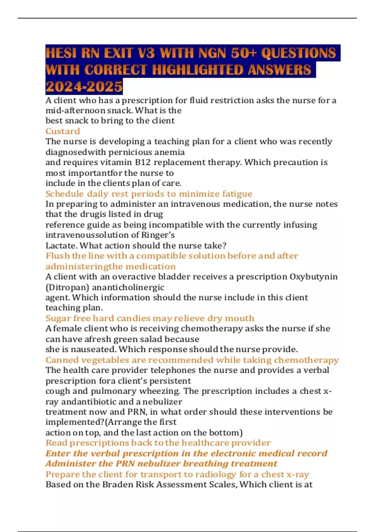 HESI RN EXIT V3 WITH NGN 50+ QUESTIONS WITH CORRECT HIGHLIGHTED ANSWERS