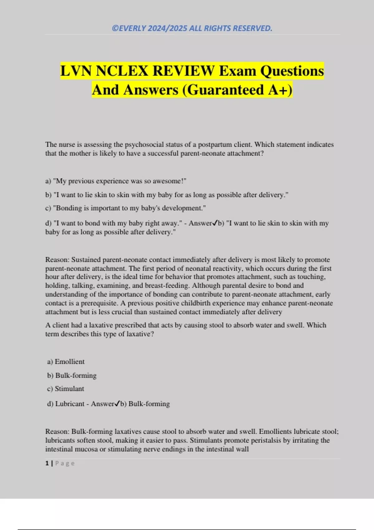 LVN NCLEX REVIEW Exam Questions And Answers (Guaranteed A+) The nurse is assessing the psychosocial status of a postpartum client. Which statement indicates that the mother is likely to have a successful parent-neonate attachment? a) "My previous experience was so awesome!" b) "I want to lie skin to skin with my baby for as long as possible after delivery." c) "Bonding is important to my baby's development." d) "I want to bond with my baby right away." - Answerb) "I want to lie skin to skin with my baby for as long as possible after delivery." Reason: Sustained parent-neonate contact immediately after delivery is most likely to promote parent-neonate attachment. The first period of neonatal reactivity, which occurs during the first hour after delivery, is the ideal time for behavior that promotes attachment, such as touching, holding, talking, examining, and breast-feeding. Although parental desire to bond and understanding of the importance of bonding can contribute to parent-neonate attachment, early contact is a prerequisite. A previous positive childbirth experience may enhance parent-neonate attachment but is less crucial than sustained contact immediately after delivery A client had a laxative prescribed that acts by causing stool to absorb water and swell. Which term describes this type of laxative? a) Emollient b) Bulk-forming c) Stimulant d) Lubricant - Answerb) Bulk-forming Reason: Bulk-forming laxatives cause stool to absorb water and swell. Emollients lubricate stool; lubricants soften stool, making it easier to pass. Stimulants promote peristalsis by irritating the intestinal mucosa or stimulating nerve endings in the intestinal wall ©EVERLY 2024/2025 ALL RIGHTS RESERVED. 2 | P a g e The nurse is caring for a client with celiac disease. How should the nurse evaluate the effectiveness of nutritional therapy? a) Measure blood urea nitrogen and serum creatinine levels. b) Measure intake and output. c) Monitor vital signs every 4 hours. d) Monitor the appearance, size, and number of stools. - Answerd) Monitor the appearance, size, and number of stools. Reason: When a client with celiac disease is placed on a gluten-free diet, fat, bulky, foul- smelling stools should be eliminated. This indicates that the disease is controlled and the client is using nutrients effectively. Taking vital signs, measuring blood urea nitrogen and serum creatinine levels, and measuring intake and output don't provide an indication of the effectiveness of diet therapy What elements must be proven by a client's attorney in the case of a professional negligence action? a) Duty, breach of duty, and damages b) Duty, damages, and causation c) Breach of duty, damages, and causation d) Duty, breach of duty, damages, and causation - Answerd) Duty, breach of duty, damages, and causation Reason: Any professional negligence action must meet certain demands in order to be considered negligence and result in legal action. They're commonly known as the four D's: duty of the health care professional to provide care to the person making the claim, a dereliction (breach) of that duty, damages resulting from that breach of duty, and evidence that damages were directly due to negligence (causation) The infection control nurse is making rounds to ensure that airborne precautions are being observed while caring for clients with tuberculosis. Which action by the staff nurse requires further education? a) The nurse double-bags respiratory secretions. b) The nurse dons a surgical isolation mask when entering the client's room. ©EVERLY 2024/2025 ALL RIGHTS RESERVED. 3 | P a g e c) The client's meals are served on disposable trays. d) The nurse gathers disposable client care items. - Answerb) The nurse dons a surgical isolation mask when entering the client's room. Reason: When entering the room of a client with tuberculosis, the nurse should wear an N95 particulate respirator mask because surgical isolation masks allow turbide bacilli to pass through. All trash and waste should be disposed of as infectious waste. All client care items and meal trays should be disposable The nurse is caring for a client who underwent internal fixation of the right hip. Before administering the client's warfarin, the nurse checks the laboratory report for the client's International Normalized Ratio (INR) results. Which of the following indicates the therapeutic range for this client? a) 1.0 to 2.0 b) 2.0 to 3.0 c) 1.5 to 2.0 d) 3.0 to 4.0 - Answerb) 2.0 to 3.0 Reason: Recent guidelines recommend an INR of 2.0 to 3.0 for clients without mechanical prosthetic heart valves who are receiving warfarin therapy. For clients with mechanical prosthetic heart valves, an INR of 2.5 to 3.5 is suggested. An INR below 2.0 is subtherapeutic with warfarin therapy. An INR above 3.0 in a client without a prosthetic valve indicates the need to reduce the warfarin dose. A nurse is caring for a client with multiple myeloma. What is a sign that a client with multiple myeloma isn't coping well with his prognosis? a) He shows concern about his family during his treatment. b) He avoids any conversation concerning his health. c) He becomes tearful when discussing his condition. d) He asks questions about his prognosis. - Answerb) He avoids any conversation concerning his health. Reason: A client with multiple myeloma who avoids conversation may be denying his condition, which can interfere with treatment. Crying is a normal response to his disease. Asking questions about his prognosis is a normal coping