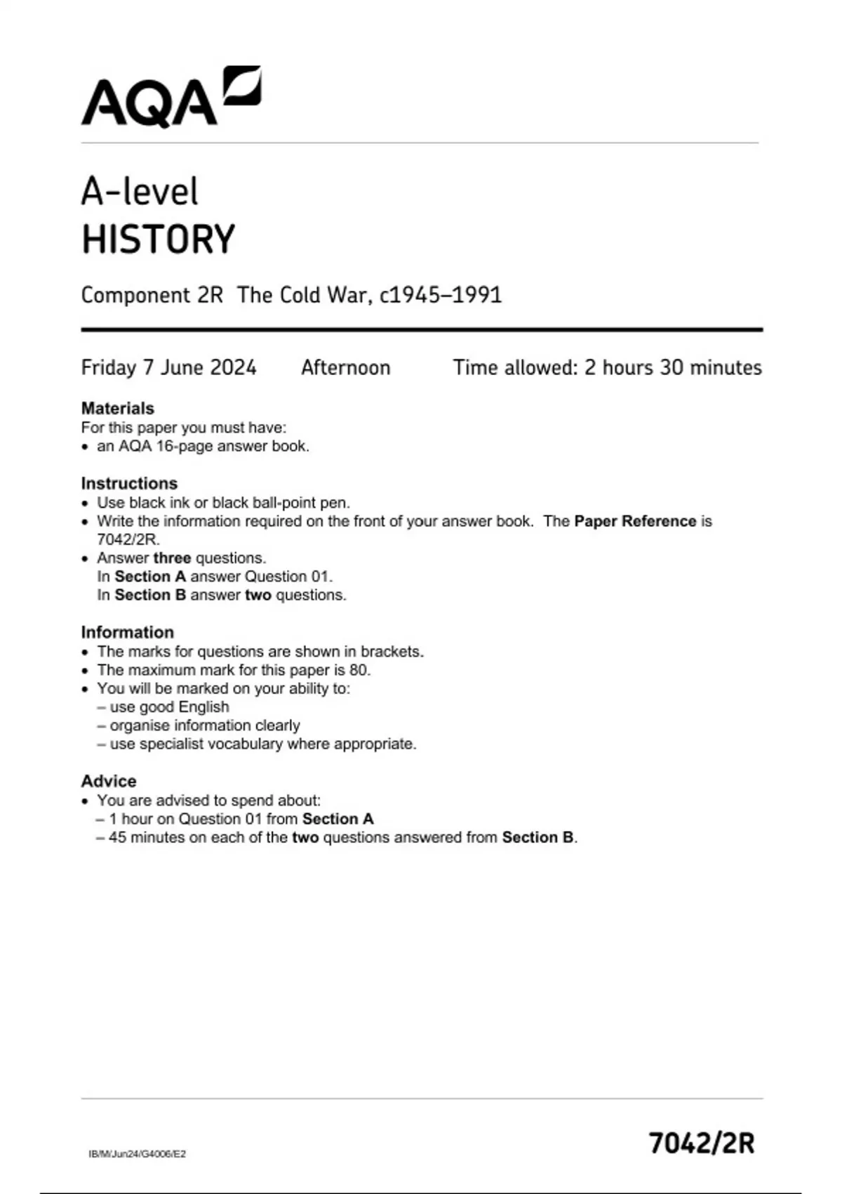 AQA A-level HISTORY Component 2R JUNE 2024 QUESTION PAPER: The Cold War, c1945–1991