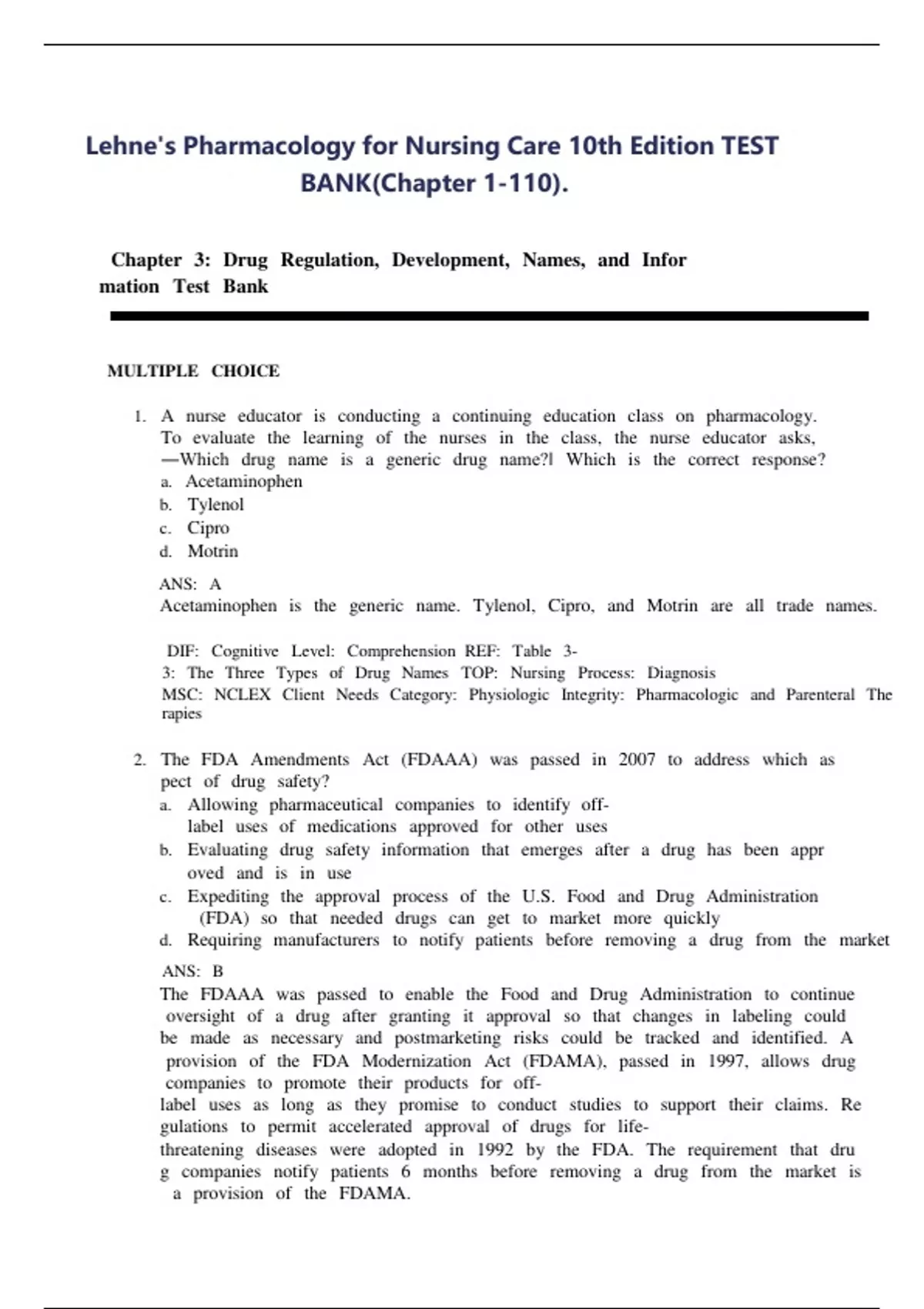 ,TestnoBanknoLehne'snoPharmacologynofornoNursingnoCare,no11thn