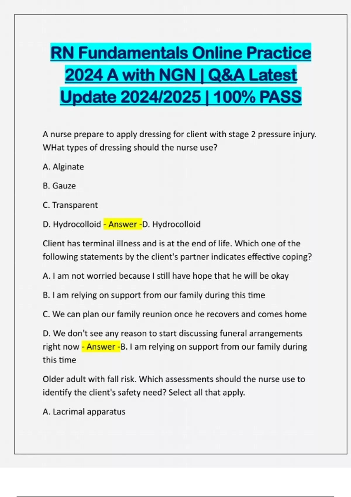 RN Fundamentals Online Practice 2024 A with NGN | Q&A Latest Update 2024/2025 | 100% PASS A nurse prepare to apply dressing for client with stage 2 pressure injury. WHat types of dressing should the nurse use? A. Alginate B. Gauze C. Transparent D. Hydrocolloid - Answer -D. Hydrocolloid Client has terminal illness and is at the end of life. Which one of the following statements by the client's partner indicates effective coping? A. I am not worried because I still have hope that he will be okay B. I am relying on support from our family during this time C. We can plan our family reunion once he recovers and comes home D. We don't see any reason to start discussing funeral arrangements right now - Answer -B. I am relying on support from our family during this time Older adult with fall risk. Which assessments should the nurse use to identify the client's safety need? Select all that apply. A. Lacrimal apparatusB. Pupil clarity C. Appearance of bulbar conjunctivae D. Visual fields E. Visual acuity - Answer -B. Pupil clarity