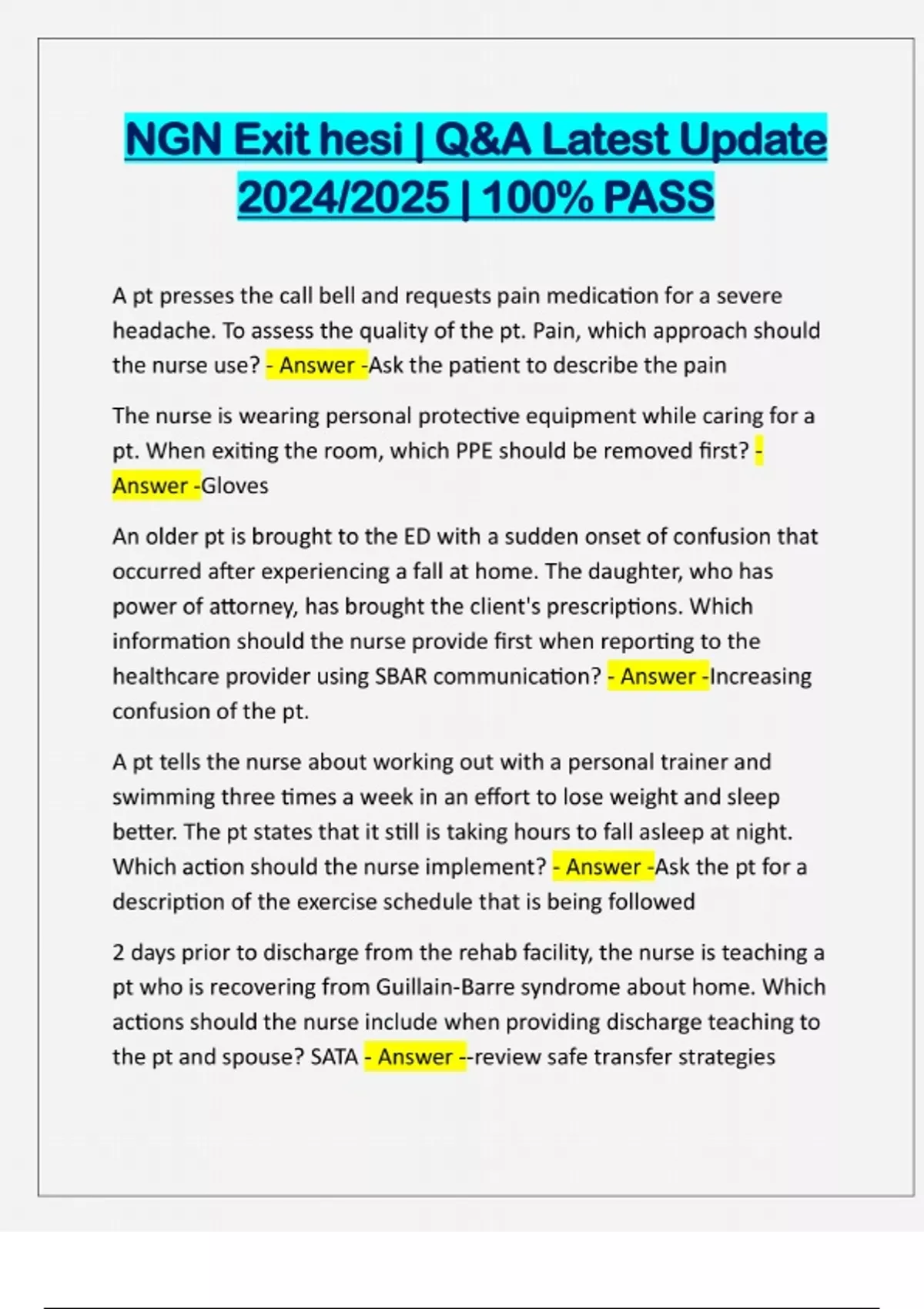 NGN Exit hesi | Q&A Latest Update 2024/2025 | 100% PASS A pt presses the call bell and requests pain medication for a severe headache. To assess the quality of the pt. Pain, which approach should the nurse use? - Answer -Ask the patient to describe the pain The nurse is wearing personal protective equipment while caring for a pt. When exiting the room, which PPE should be removed first? - Answer -Gloves An older pt is brought to the ED with a sudden onset of confusion that occurred after experiencing a fall at home. The daughter, who has power of attorney, has brought the client's prescriptions. Which information should the nurse provide first when reporting to the healthcare provider using SBAR communication? - Answer -Increasing confusion of the pt. A pt tells the nurse about working out with a personal trainer and swimming three times a week in an effort to lose weight and sleep better. The pt states that it still is taking hours to fall asleep at night. Which action should the nurse implement? - Answer -Ask the pt for a description of the exercise schedule that is being followed 2 days prior to discharge from the rehab facility, the nurse is teaching a pt who is recovering from Guillain-Barre syndrome about home. Which actions should the nurse include when providing discharge teaching to the pt and spouse? SATA - Answer --review safe transfer strategies-develop a nutritional plan -help identify community support