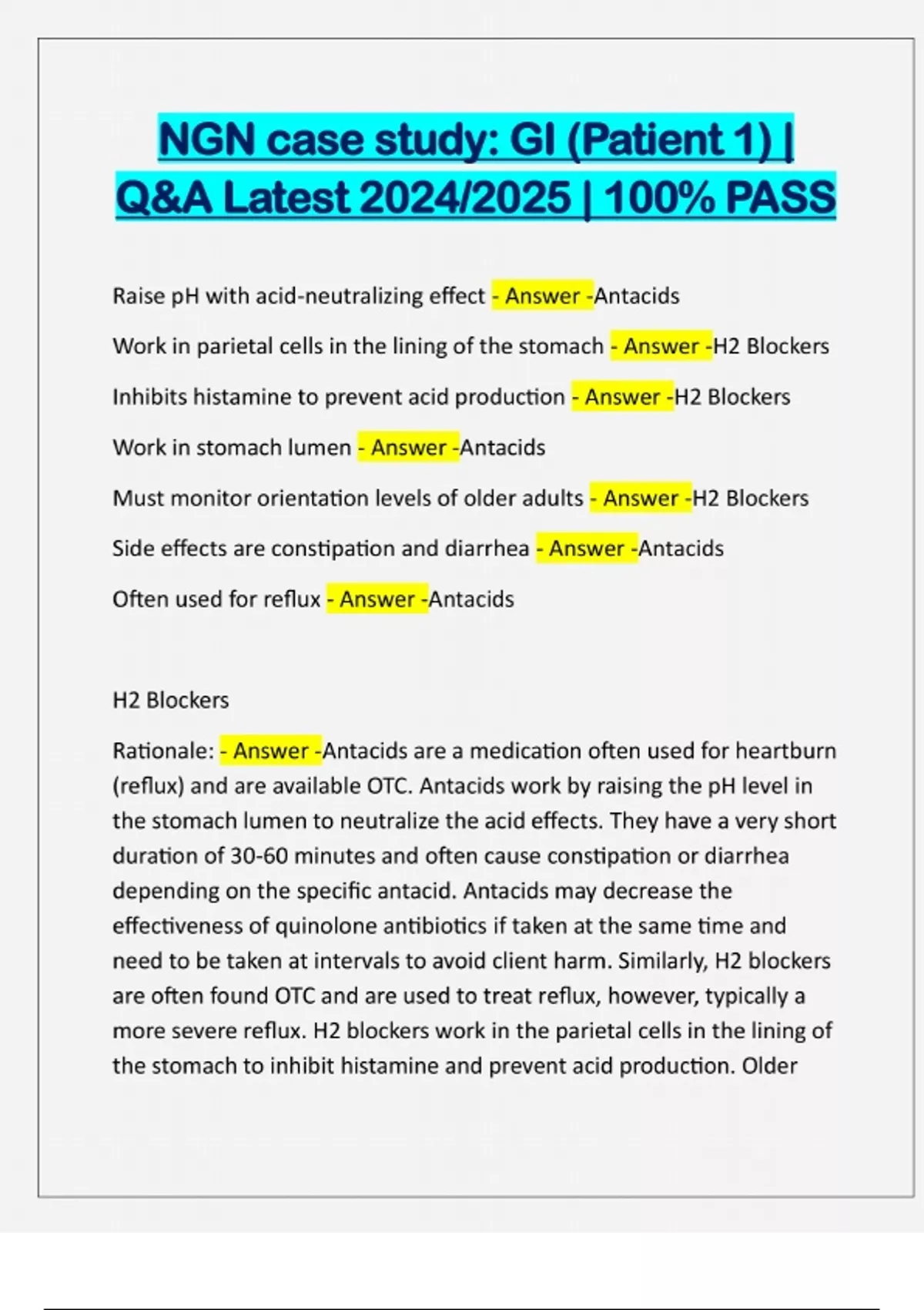 NGN case study: GI (Patient 1) | Q&A Latest 2024/2025 | 100% PASS Raise pH with acid-neutralizing effect - Answer -Antacids Work in parietal cells in the lining of the stomach - Answer -H2 Blockers Inhibits histamine to prevent acid productio
