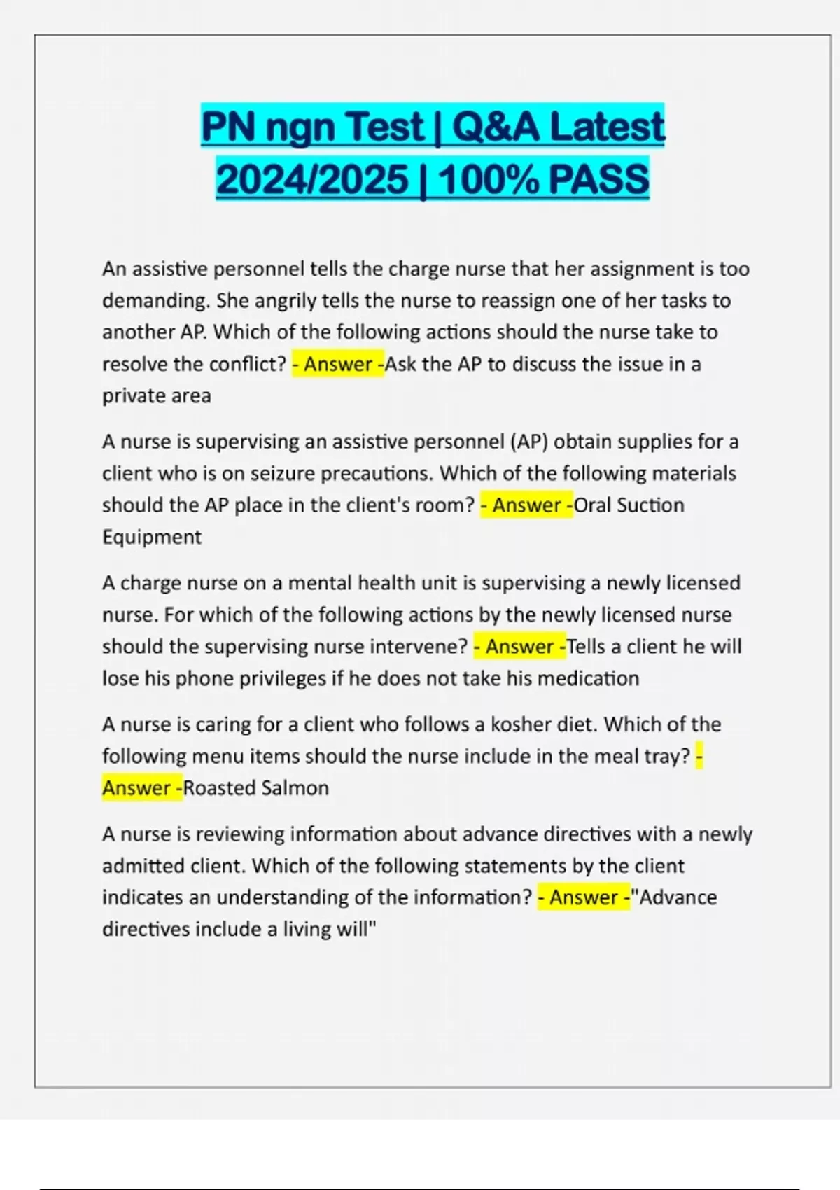 PN ngn Test | Q&A Latest 2024/2025 | 100% PASS An assistive personnel tells the charge nurse that her assignment is too demanding. She angrily tells the nurse to reassign one of her tasks to another AP. Which of the following actions should the nurse take to resolve the conflict? - Answer -Ask the AP to discuss the issue in a private area A nurse is supervising an assistive personnel (AP) obtain supplies for a client who is on seizure precautions. Which of the following materials should the AP place in the client's room? - Answer -Oral Suction Equipment A charge nurse on a mental health unit is supervising a newly licensed nurse. For which of the following actions by the newly licensed nurse should the supervising nurse intervene? - Answer -Tells a client he will lose his phone privileges if he does not take his medication A nurse is caring for a client who follows a kosher diet. Which of the following menu items should the nurse include in the meal tray? - Answer -Roasted Salmon A nurse is reviewing information about advance directives with a newly admitted client. Which of the following statements by the client indicates an understanding of the information? - Answer -"Advance directives include a living will"