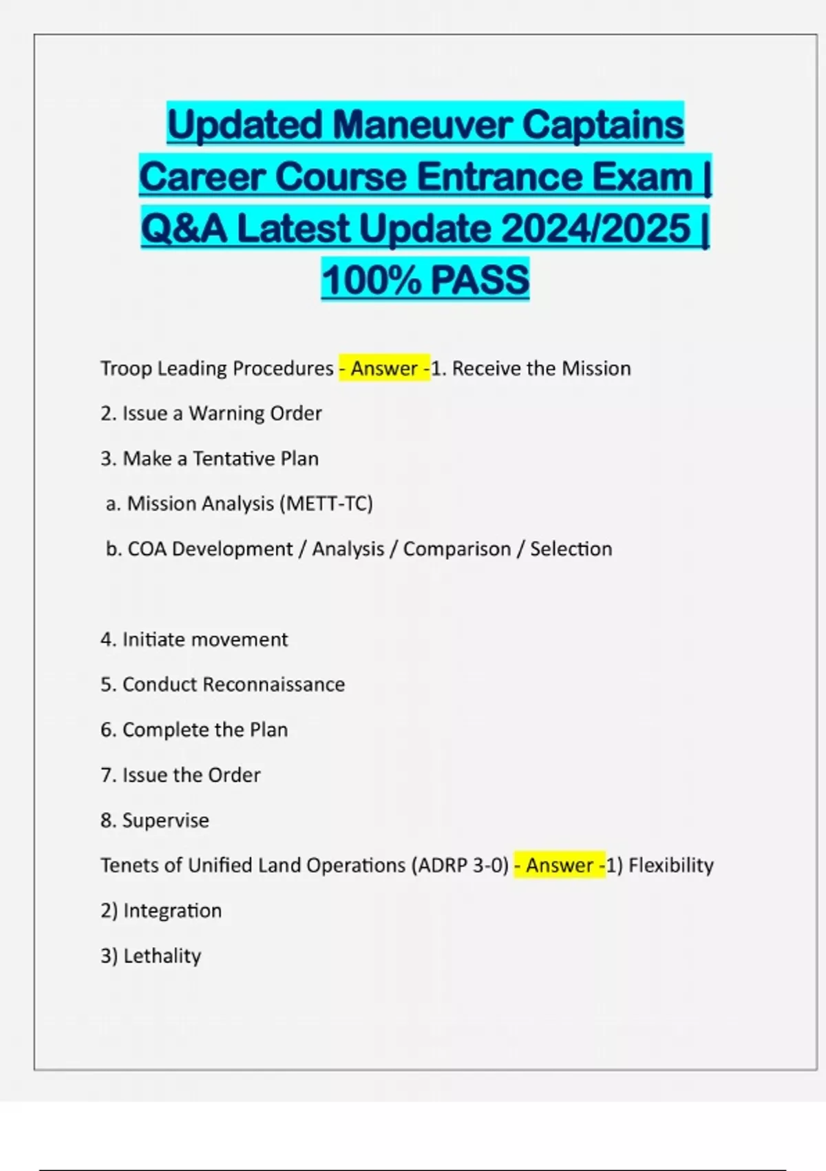 Updated Maneuver Captains Career Course Entrance Exam | Q&A Latest Update 2024/2025 | 100% PASS Troop Leading Procedures - Answer -1. Receive the Mission 2. Issue a Warning Order 3. Make a Tentative Plan a. Mission Analysis (METT-TC) b. COA Development / Analysis / Comparison / Selection 4. Initiate movement 5. Conduct Reconnaissance 6. Complete the Plan 7. Issue the Order 8. Supervise Tenets of Unified Land Operations (ADRP 3-0) - Answer -1) Flexibility 2) Integration 3) Lethality4) Adaptability 5) Depth 6) Synchronization Foundations of Unified Land Operations (ADRP 3-0) - Answer -1) Initiative 2) Decisive Action 3) Army Core Competencies 4) Mission Command Steps of IPB (ATP 2-01.3) - Answer -1. Define the Operational Enviroment