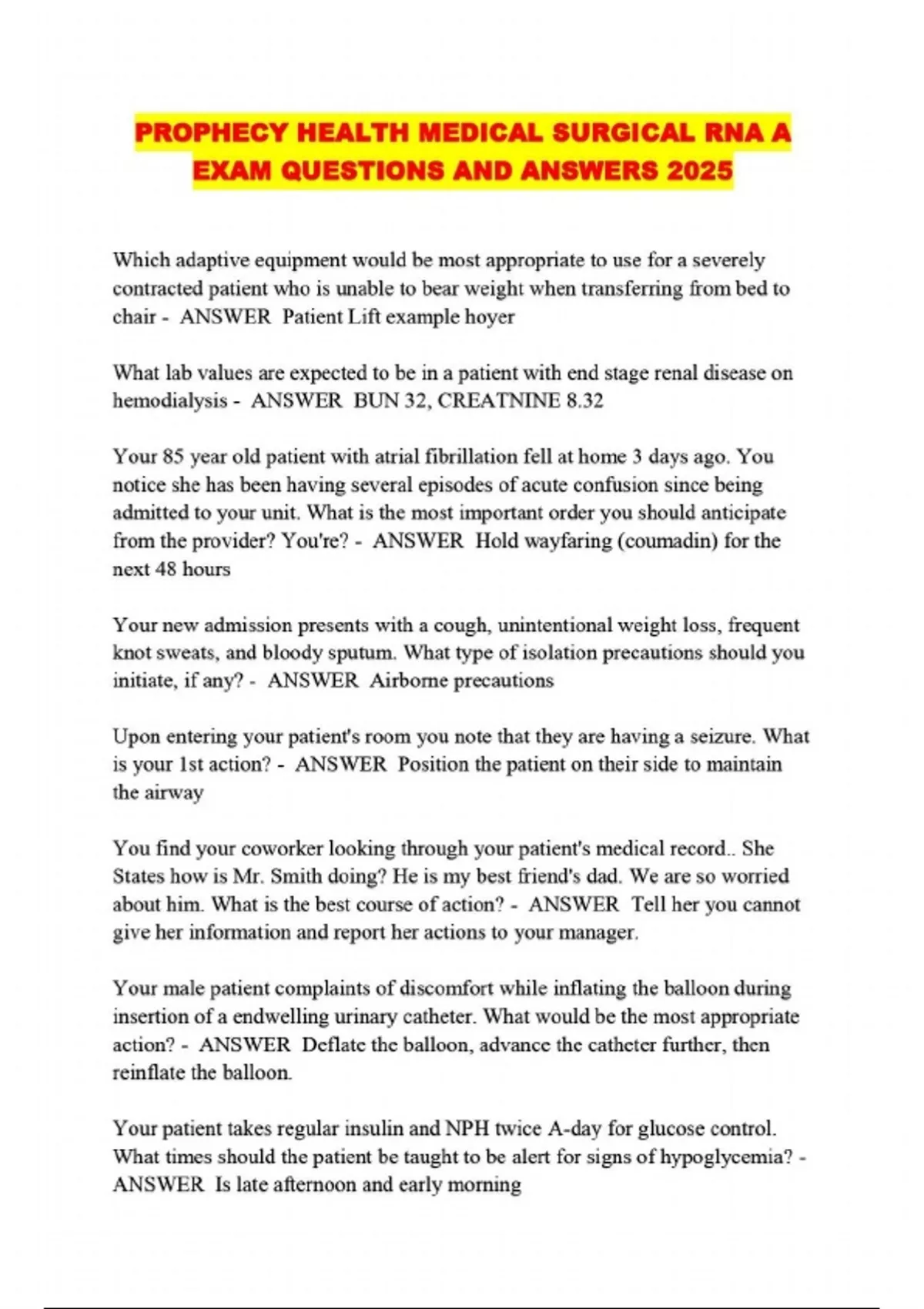 PROPHECY HEALTH MEDICAL SURGICAL RNA A EXAM QUESTIONS AND ANSWERS 2025...
