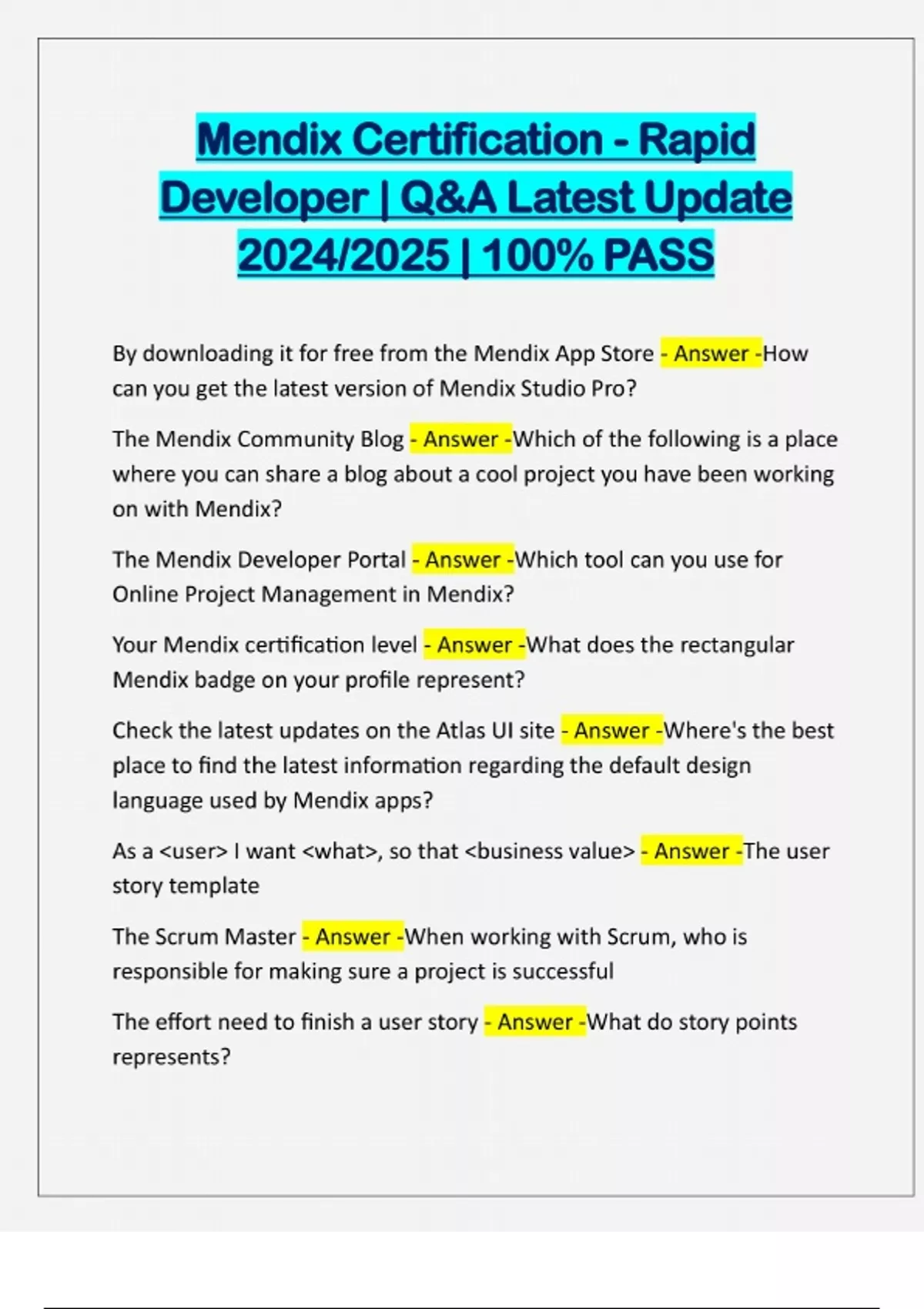 Mendix Certification - Rapid Developer | Q&A Latest Update 2024/2025 | 100% PASS By downloading it for free from the Mendix App Store - Answer -How can you get the latest version of Mendix Studio Pro? The Mendix Community Blog - Answer -Which of the following is a place where you can share a blog about a cool project you have been working on with Mendix? The Mendix Developer Portal - Answer -Which tool can you use for Online Project Management in Mendix? Your Mendix certification level - Answer -What does the rectangular Mendix badge on your profile represent? Check the latest updates on the Atlas UI site - Answer -Where's the best place to find the latest information regarding the default design language used by Mendix apps? As a <user> I want <what>, so that <business value> - Answer -The user story template The Scrum Master - Answer -When working with Scrum, who is responsible for making sure a project is successful The effort need to finish a user story - Answer